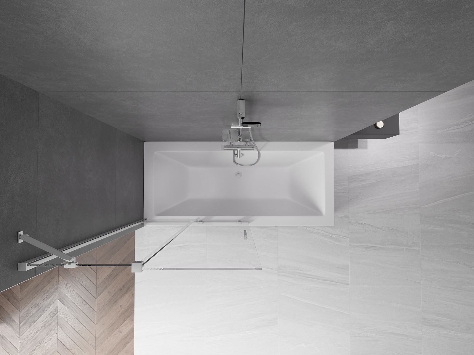 Proteção eficaz contra o derramamento de água durante o banho. O parapeito possui vedações que se ajustam perfeitamente à superfície do vidro e à borda da banheira. Solução funcional que garante segurança e fácil manutenção da limpeza.
