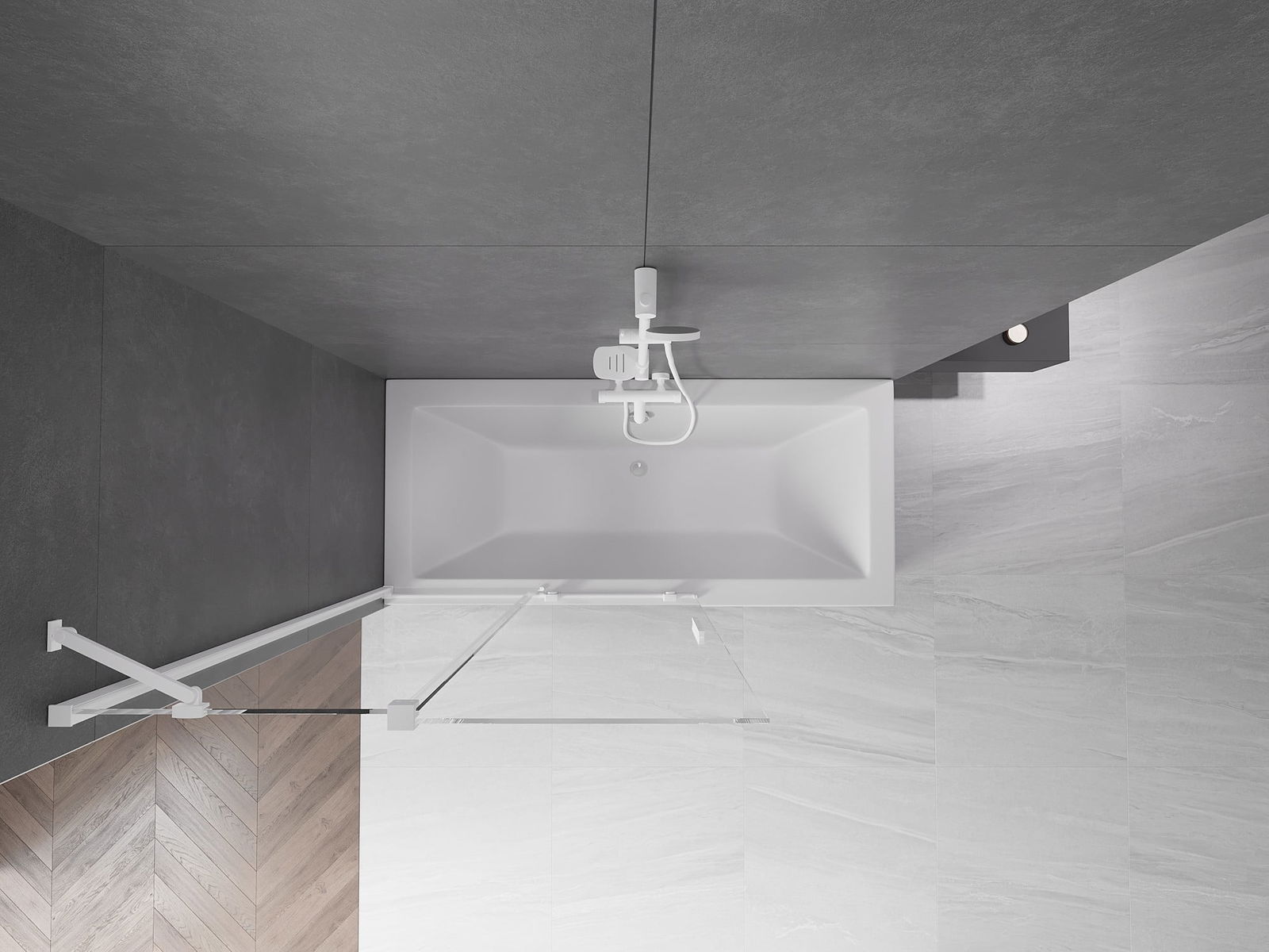 Proteção eficaz contra o derramamento de água durante o banho. O parapeito possui vedações que se ajustam perfeitamente à superfície do vidro e à borda da banheira. Solução funcional que garante segurança e fácil manutenção da limpeza.