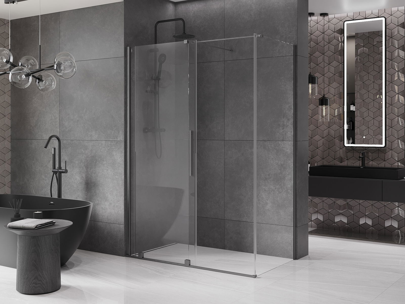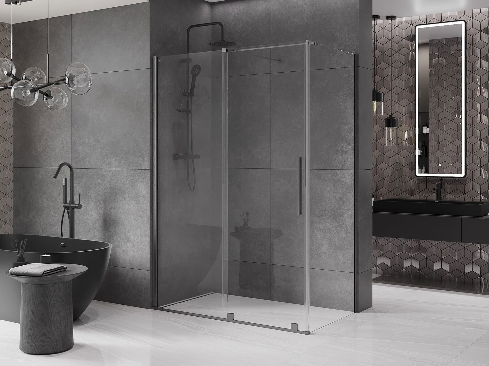 Pega prática e confortável feita de aço inoxidável. A forma moderna, combinada com o acabamento adaptado à cor dos perfis, dá ao conjunto uma aparência moderna e estilosa, realçando a estética de qualquer casa de banho.