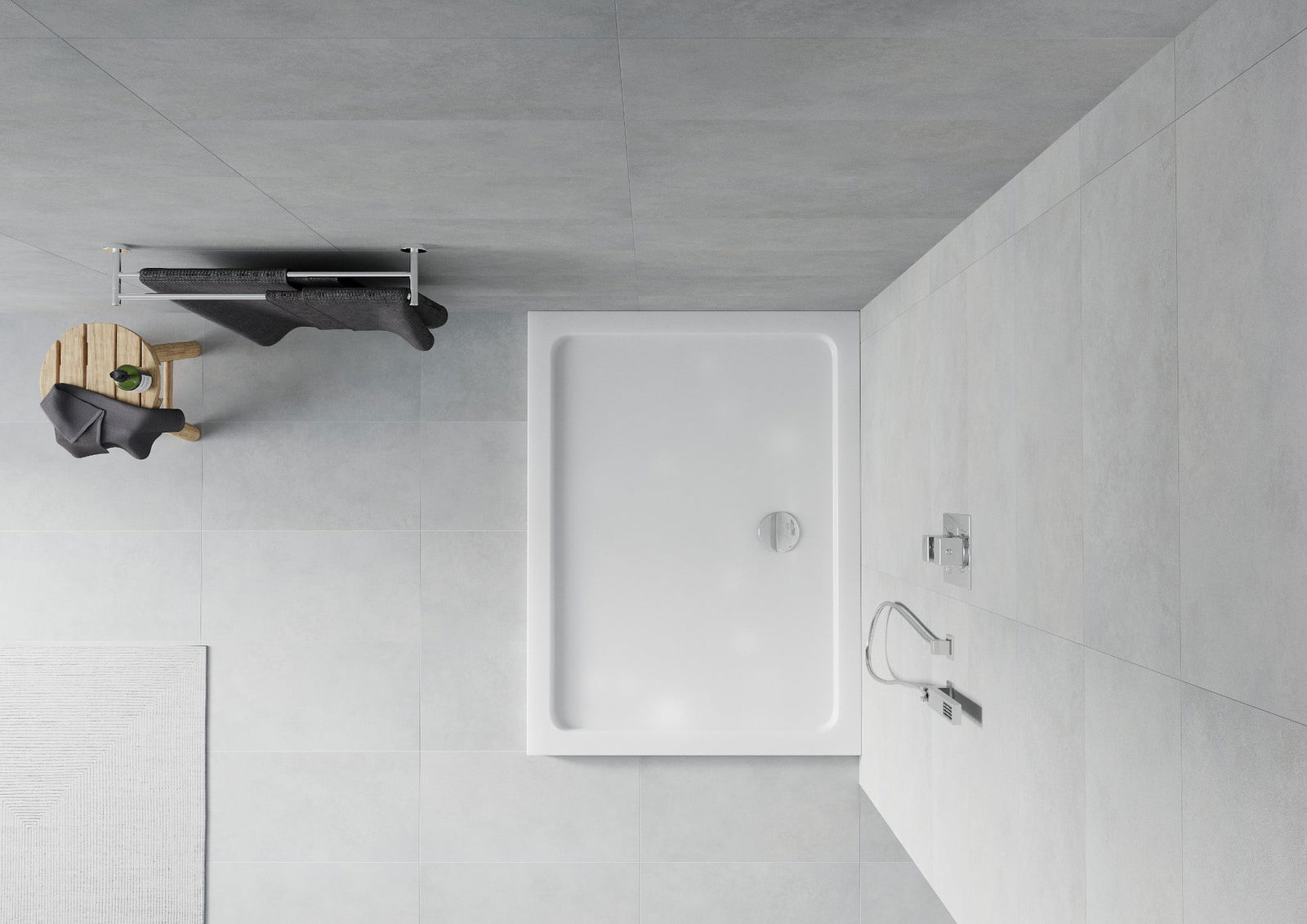 A base de duche foi concebida de forma a permitir que a água escoe livremente na direção do ralo. Assegura uma drenagem rápida e eficiente da água da superfície da base de duche, prevenindo a formação de poças e o alagamento da casa de banho.