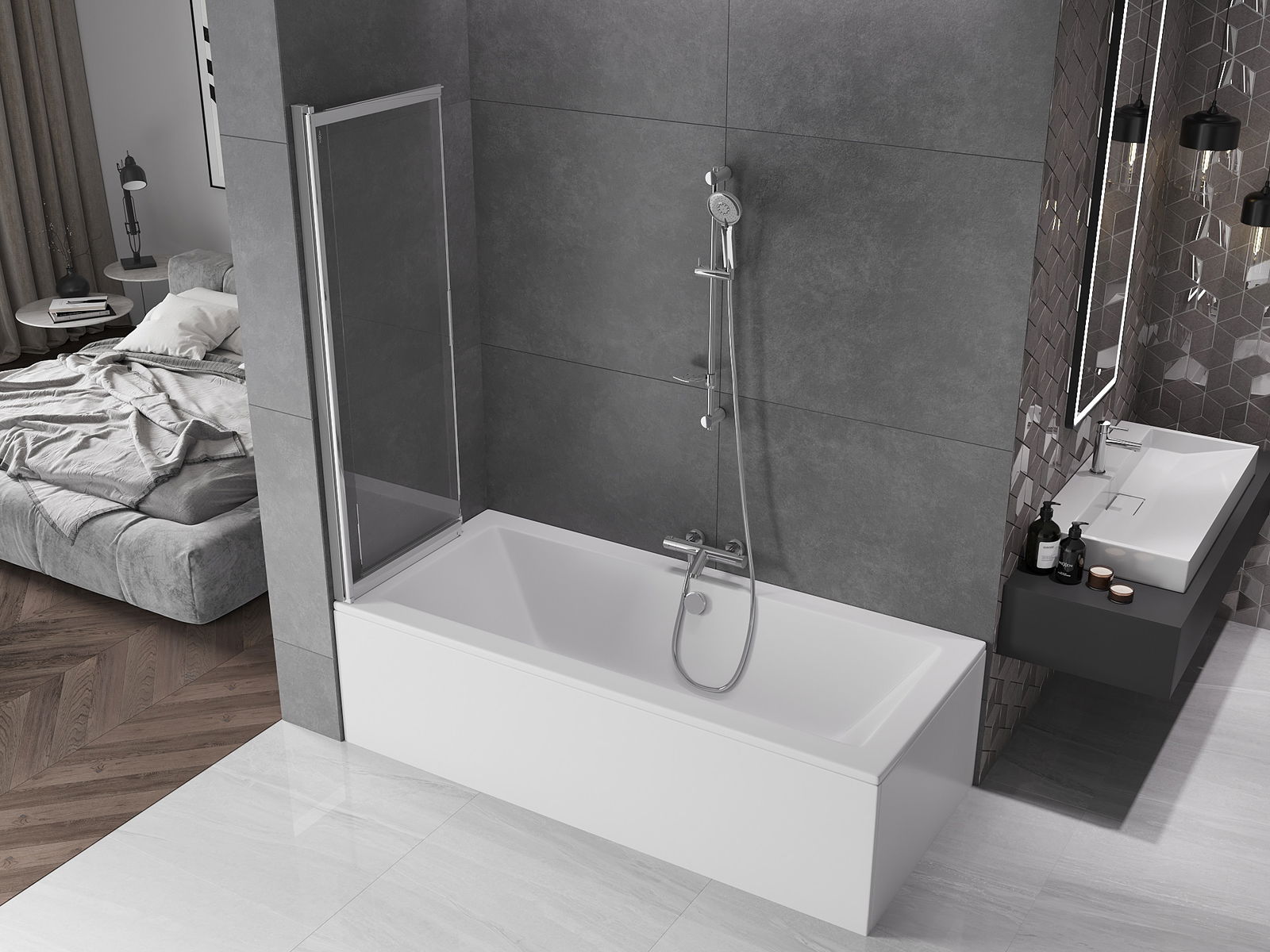 Proteção eficaz contra o derramamento de água durante o banho. O parapeito possui vedações que se ajustam perfeitamente à superfície do vidro e à borda da banheira. Solução funcional que garante segurança e fácil manutenção da limpeza.