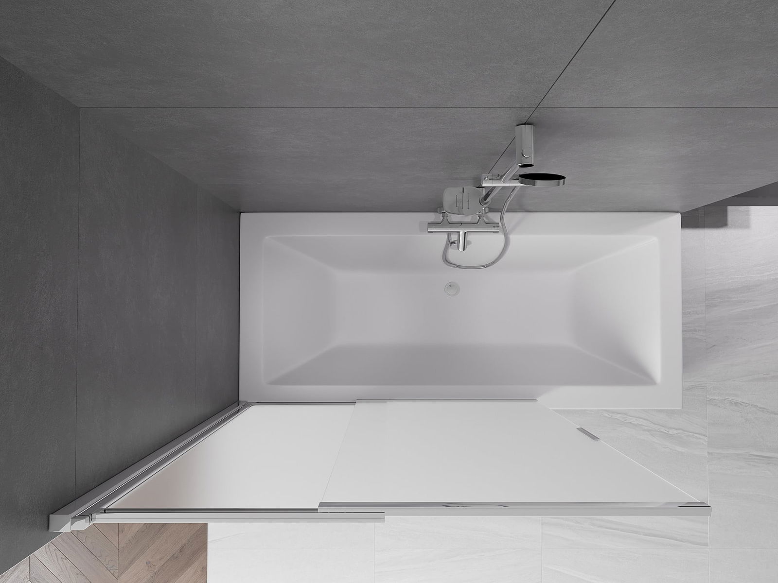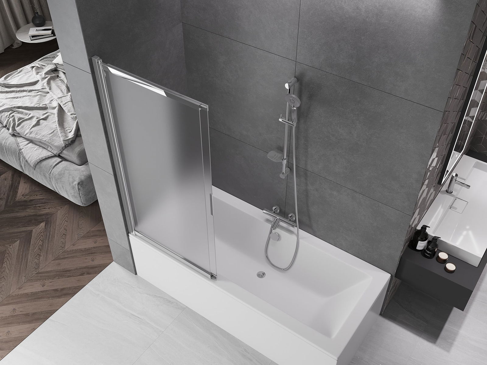 Proteção eficaz contra o derramamento de água durante o banho. O parapeito possui vedações que se ajustam perfeitamente à superfície do vidro e à borda da banheira. Solução funcional que garante segurança e fácil manutenção da limpeza.