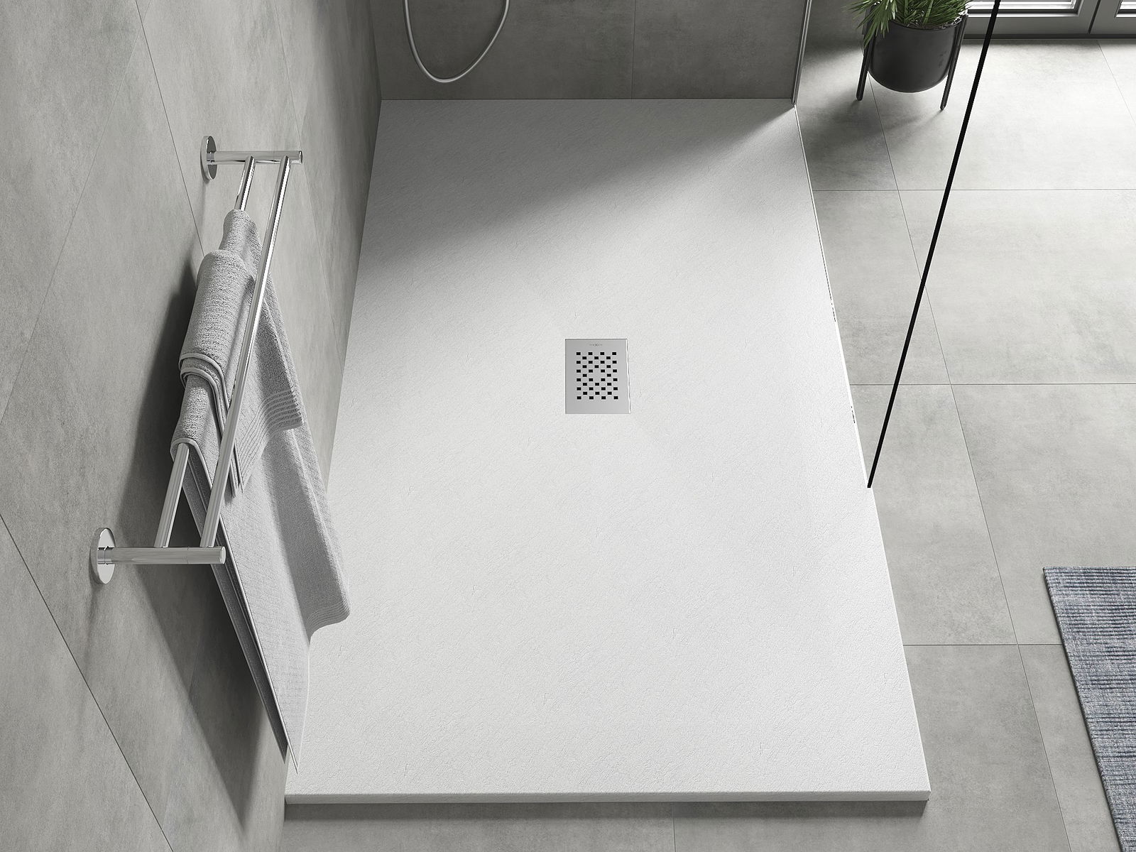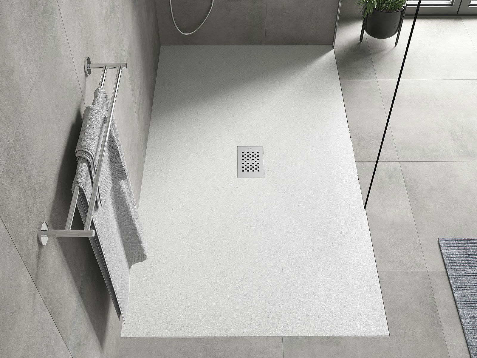 A superfície do tabuleiro do chuveiro assemelha-se a uma pedra na sua estrutura. Constitui uma combinação excecional de aparência natural com um design de interiores moderno. Adiciona caráter, realça a estética e a elegância da decoração da casa de banho e encanta com a sua forma.