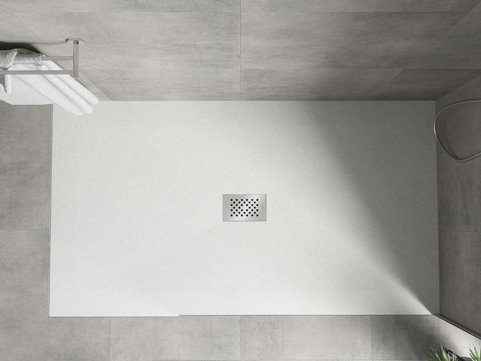 A base de duche foi concebida de forma a permitir que a água escoe livremente na direção do ralo. Assegura uma drenagem rápida e eficiente da água da superfície da base de duche, prevenindo a formação de poças e o alagamento da casa de banho.
