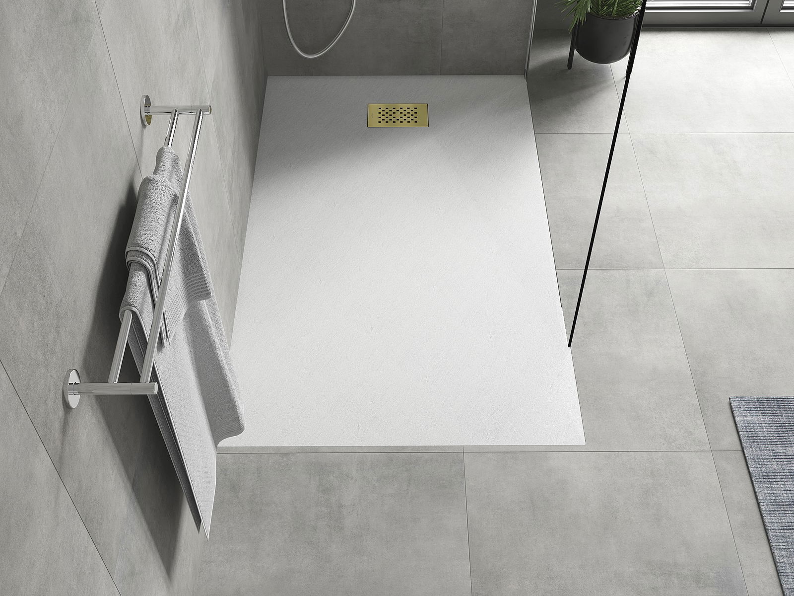 A superfície do tabuleiro do chuveiro assemelha-se a uma pedra na sua estrutura. Constitui uma combinação excecional de aparência natural com um design de interiores moderno. Adiciona caráter, realça a estética e a elegância da decoração da casa de banho e encanta com a sua forma.