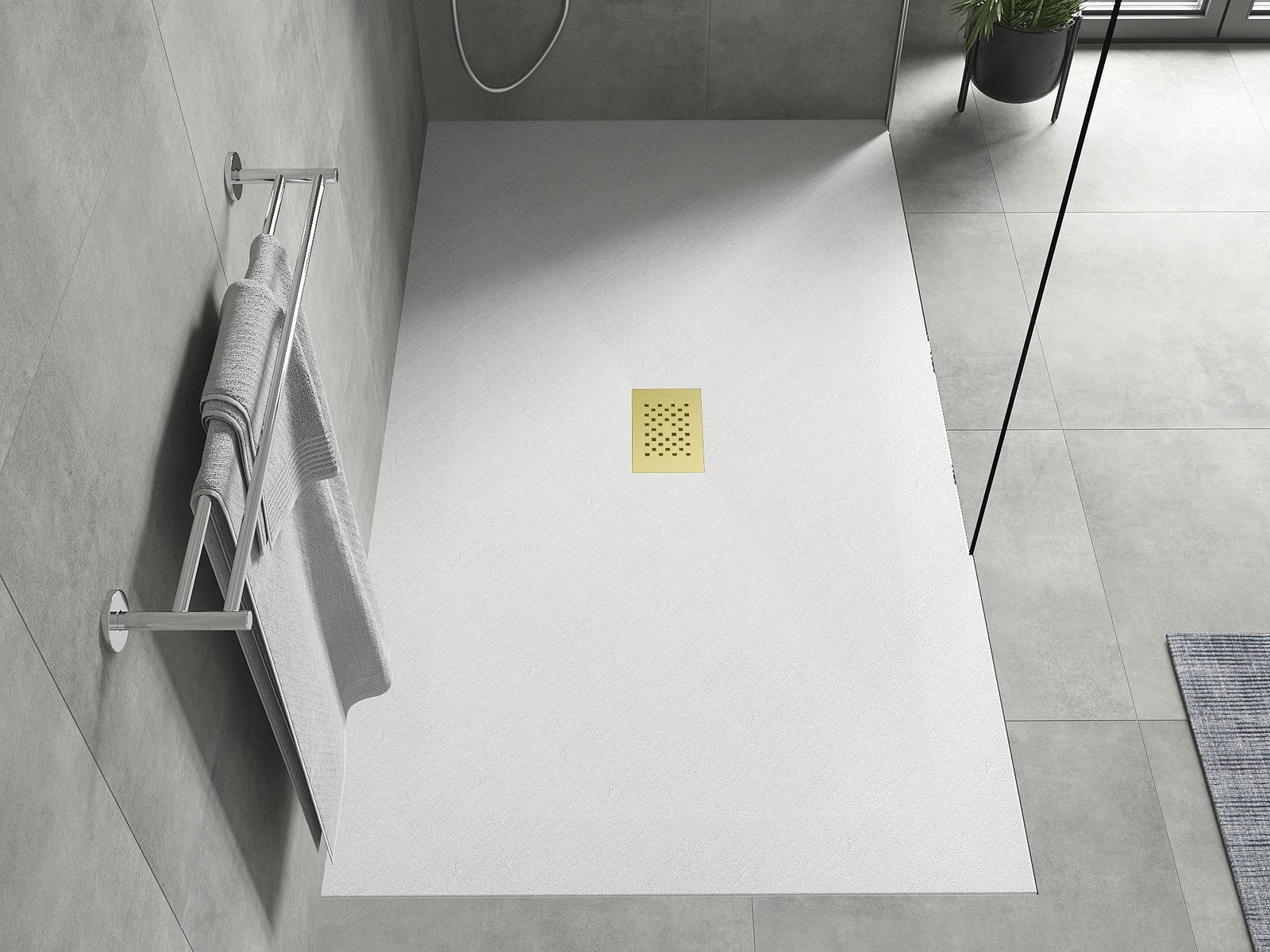 A base de duche foi concebida de forma a permitir que a água escoe livremente na direção do ralo. Assegura uma drenagem rápida e eficiente da água da superfície da base de duche, prevenindo a formação de poças e o alagamento da casa de banho.