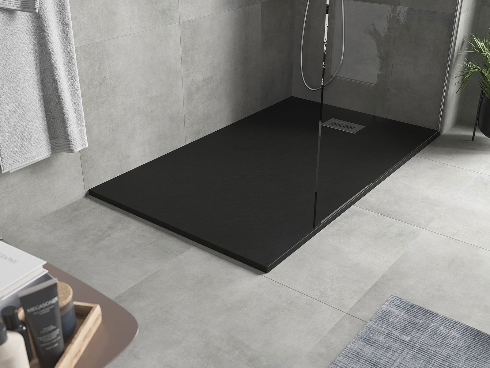 A superfície do tabuleiro do chuveiro assemelha-se a uma pedra na sua estrutura. Constitui uma combinação excecional de aparência natural com um design de interiores moderno. Adiciona caráter, realça a estética e a elegância da decoração da casa de banho e encanta com a sua forma.