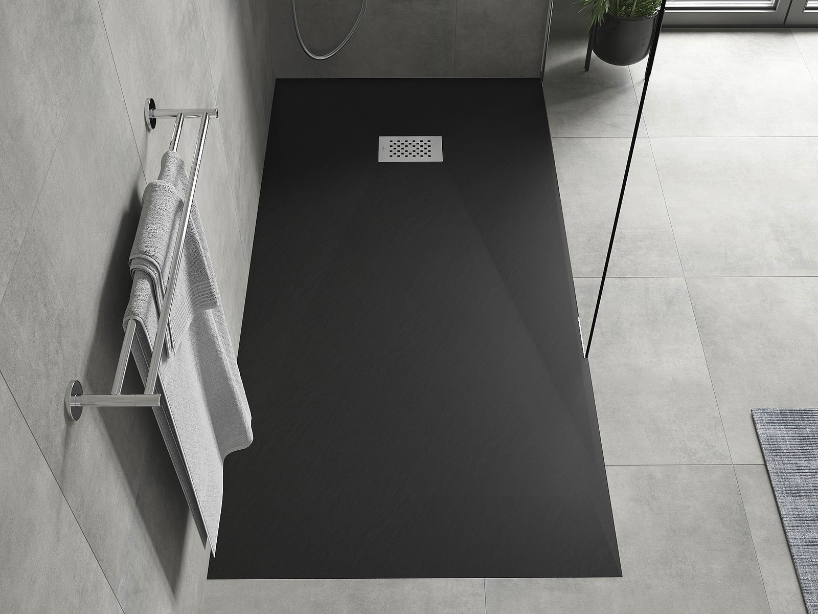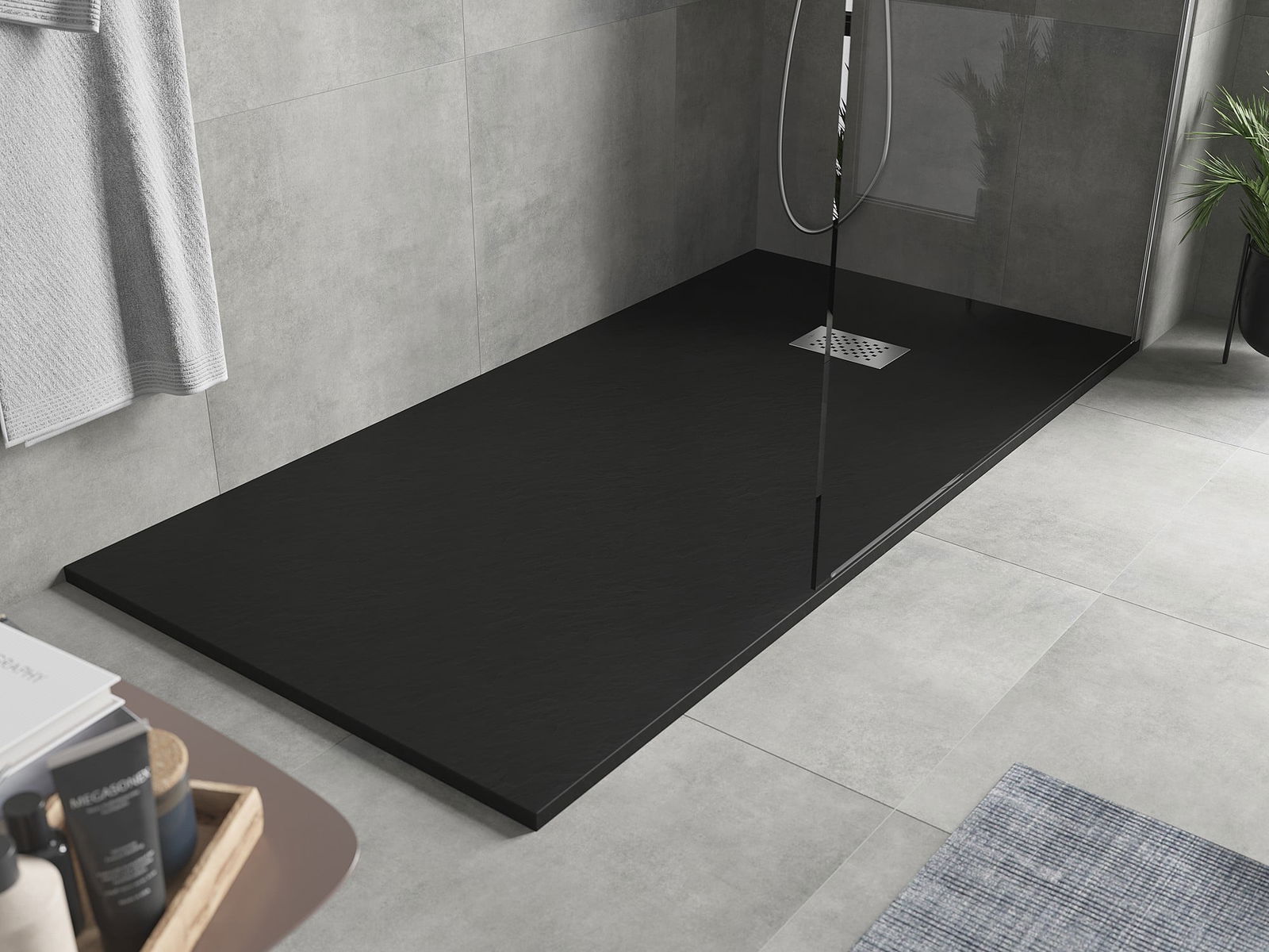 A superfície do tabuleiro do chuveiro assemelha-se a uma pedra na sua estrutura. Constitui uma combinação excecional de aparência natural com um design de interiores moderno. Adiciona caráter, realça a estética e a elegância da decoração da casa de banho e encanta com a sua forma.