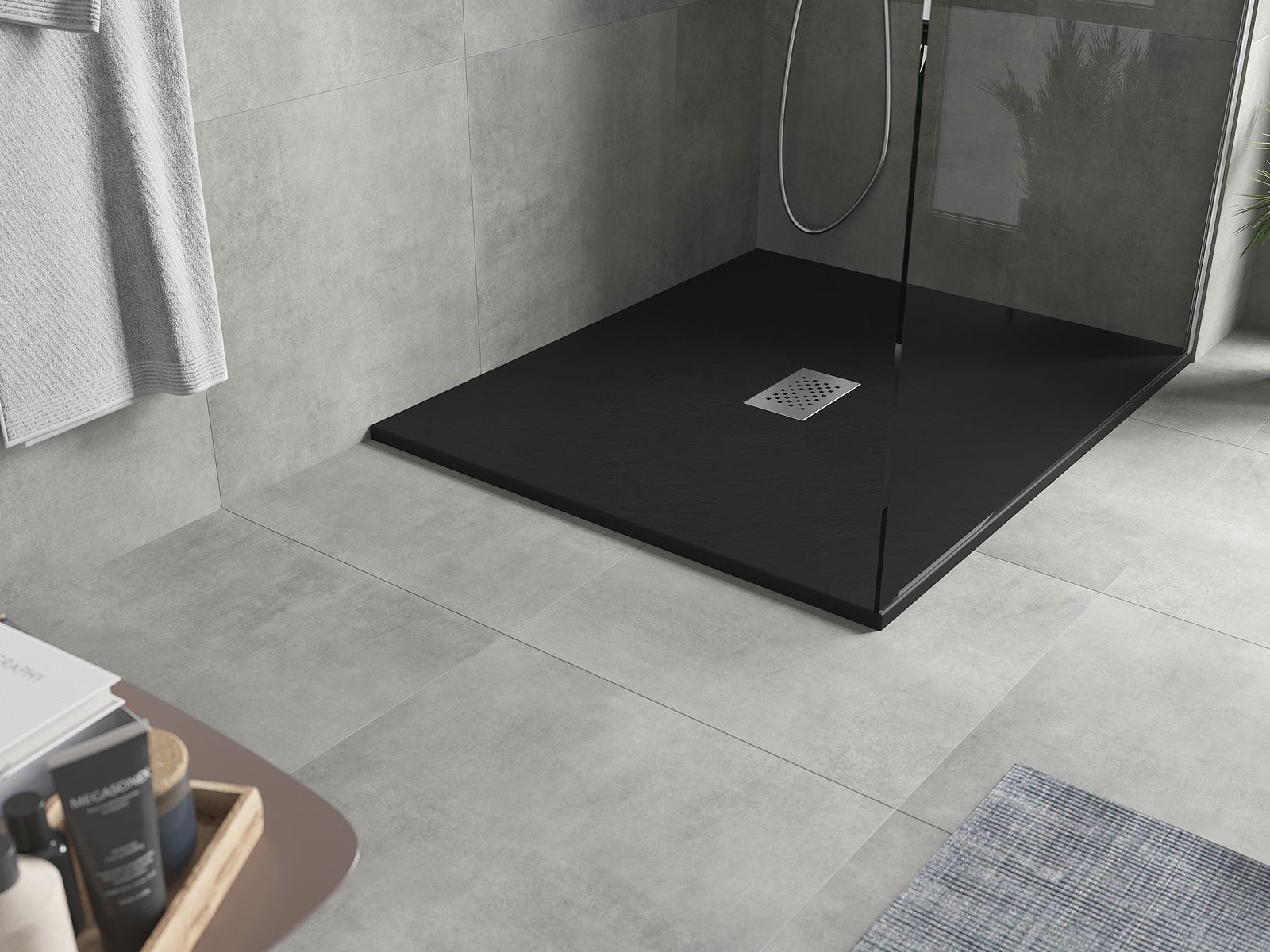 A superfície do tabuleiro do chuveiro assemelha-se a uma pedra na sua estrutura. Constitui uma combinação excecional de aparência natural com um design de interiores moderno. Adiciona caráter, realça a estética e a elegância da decoração da casa de banho e encanta com a sua forma.