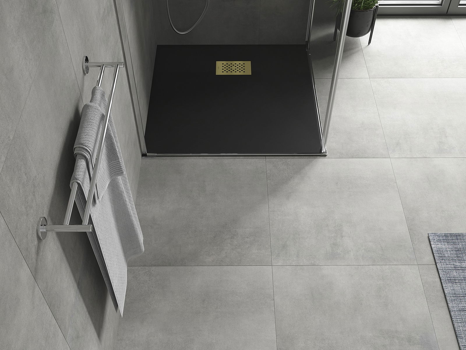 A base de duche foi concebida de forma a permitir que a água escoe livremente na direção do ralo. Assegura uma drenagem rápida e eficiente da água da superfície da base de duche, prevenindo a formação de poças e o alagamento da casa de banho.