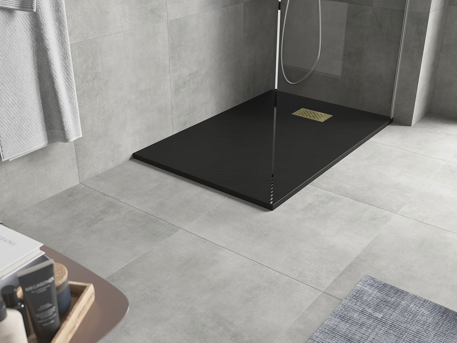 A superfície do tabuleiro do chuveiro assemelha-se a uma pedra na sua estrutura. Constitui uma combinação excecional de aparência natural com um design de interiores moderno. Adiciona caráter, realça a estética e a elegância da decoração da casa de banho e encanta com a sua forma.