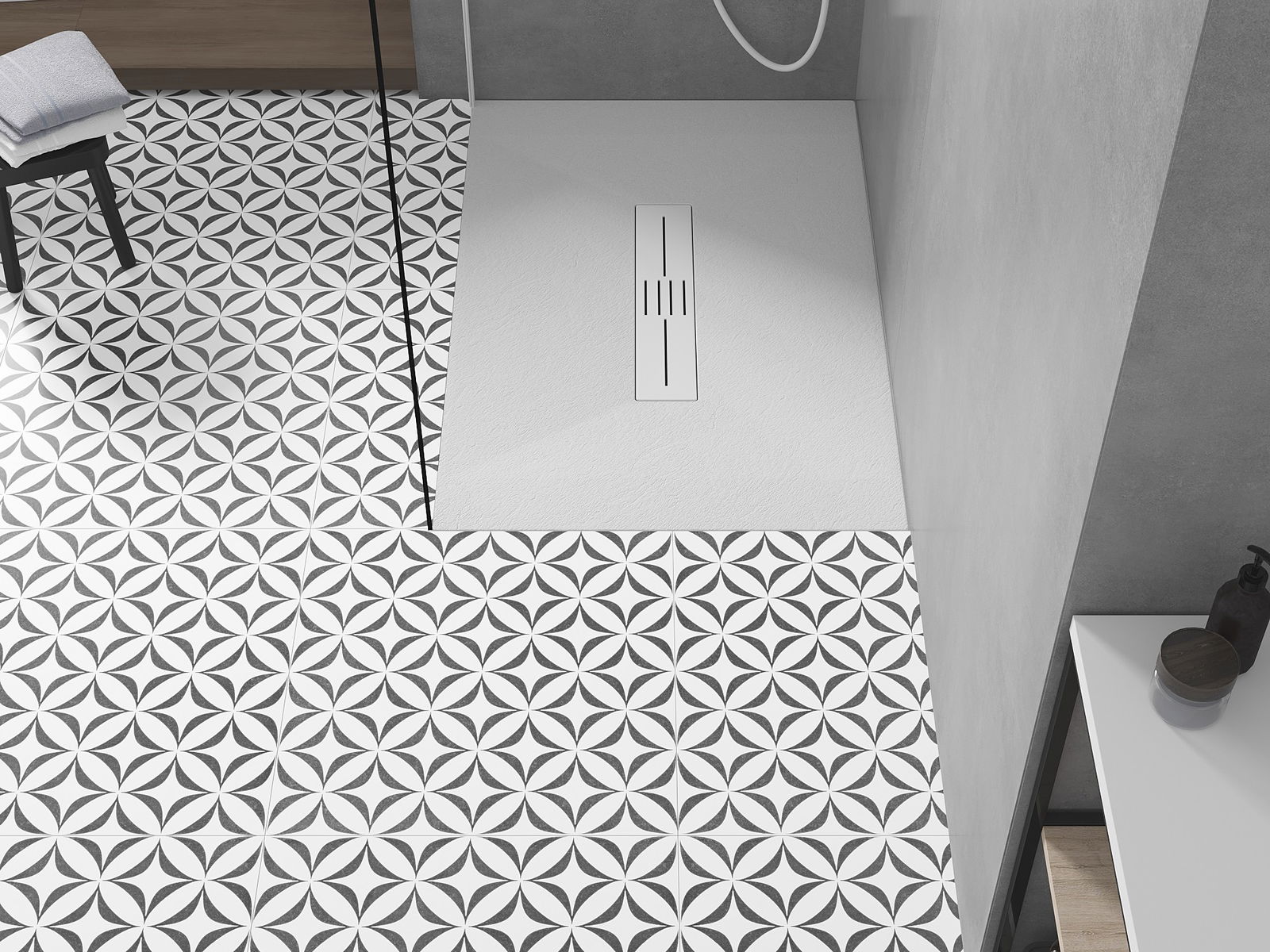 A base de duche foi concebida de forma a permitir que a água escoe livremente na direção do ralo. Assegura uma drenagem rápida e eficiente da água da superfície da base de duche, prevenindo a formação de poças e o alagamento da casa de banho.