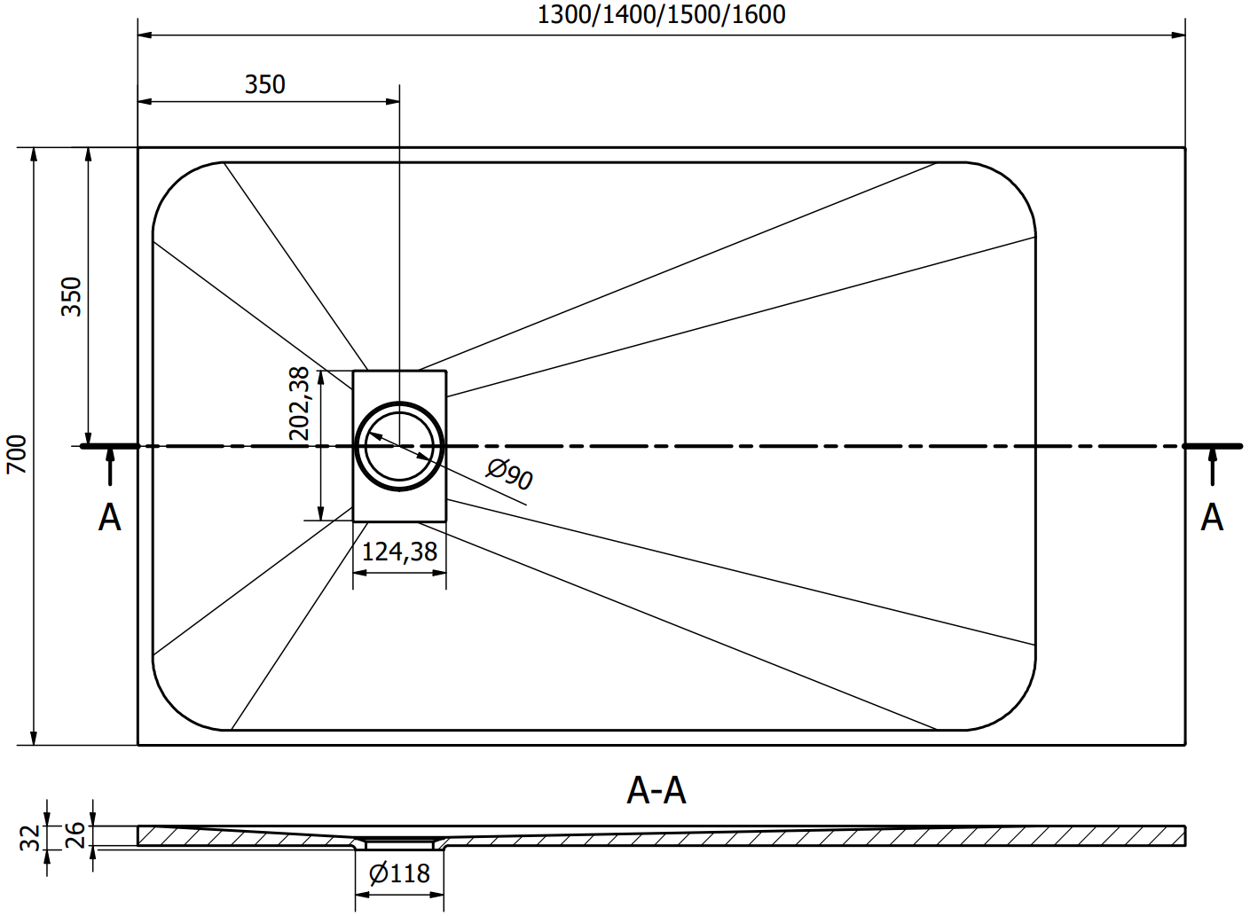 A base de duche foi concebida de forma a permitir que a água escoe livremente na direção do ralo. Assegura uma drenagem rápida e eficiente da água da superfície da base de duche, prevenindo a formação de poças e o alagamento da casa de banho.