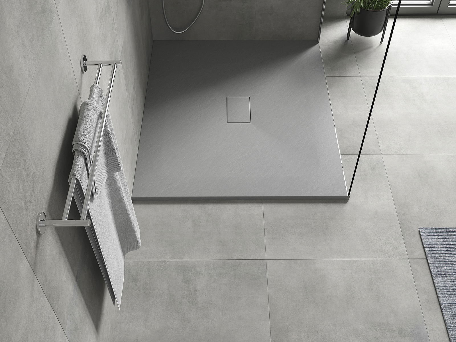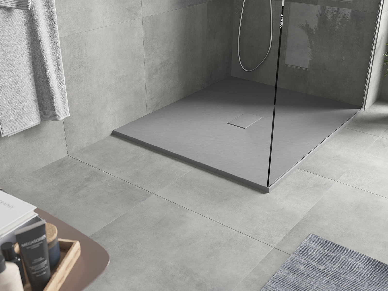 A superfície do tabuleiro do chuveiro assemelha-se a uma pedra na sua estrutura. Constitui uma combinação excecional de aparência natural com um design de interiores moderno. Adiciona caráter, realça a estética e a elegância da decoração da casa de banho e encanta com a sua forma.