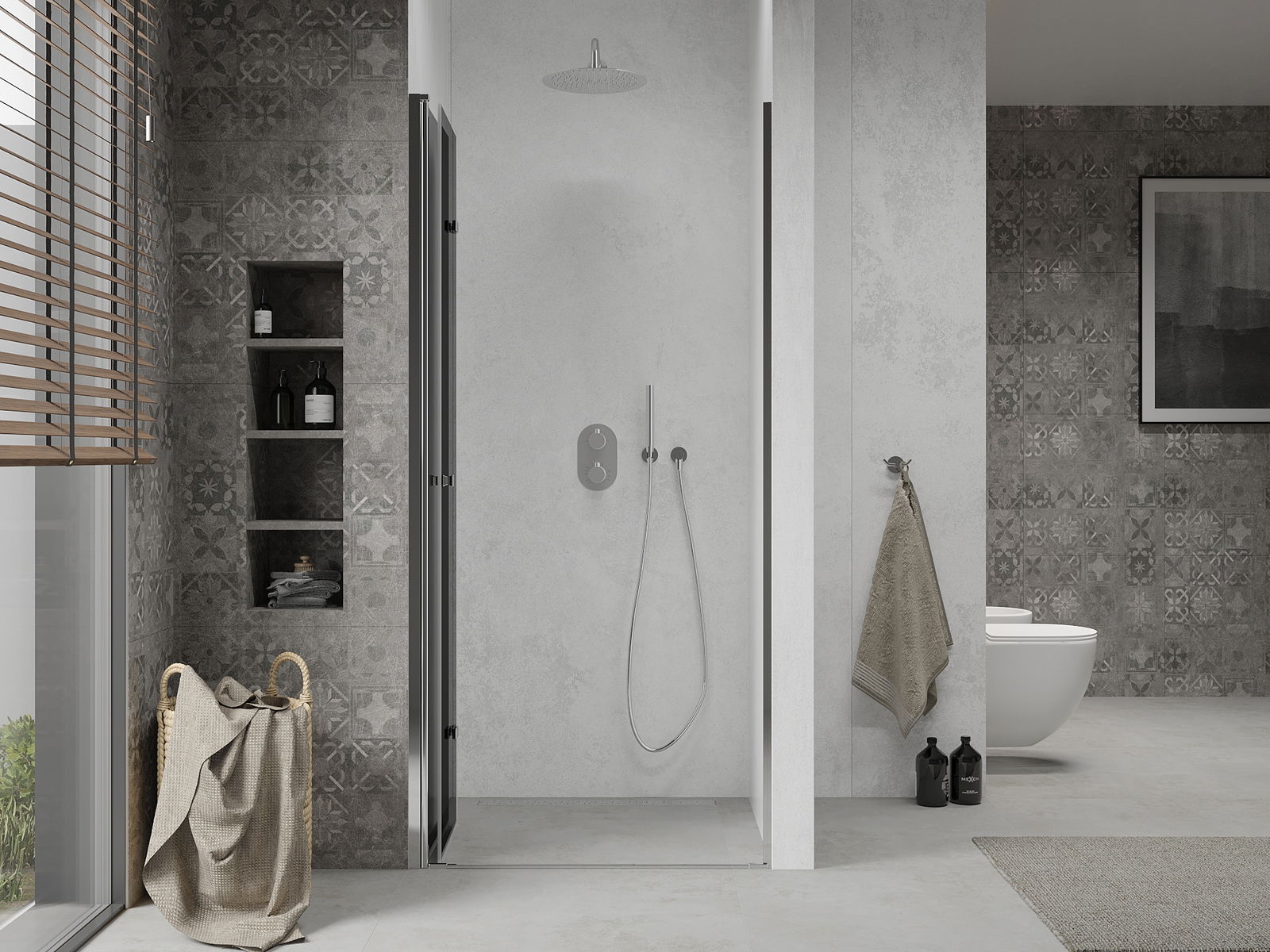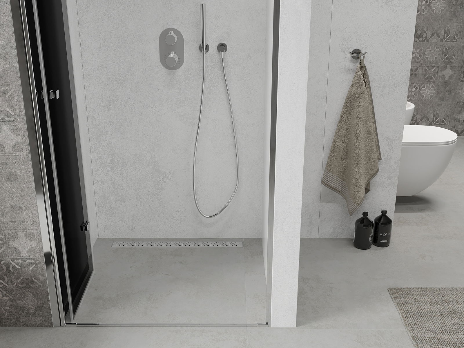 A pega prática e confortável foi feita de metal durável e resistente. A forma moderna combinada com o acabamento ajustado à cor dos perfis confere a todo o conjunto uma aparência moderna e estilosa, realçando a estética de qualquer casa de banho.