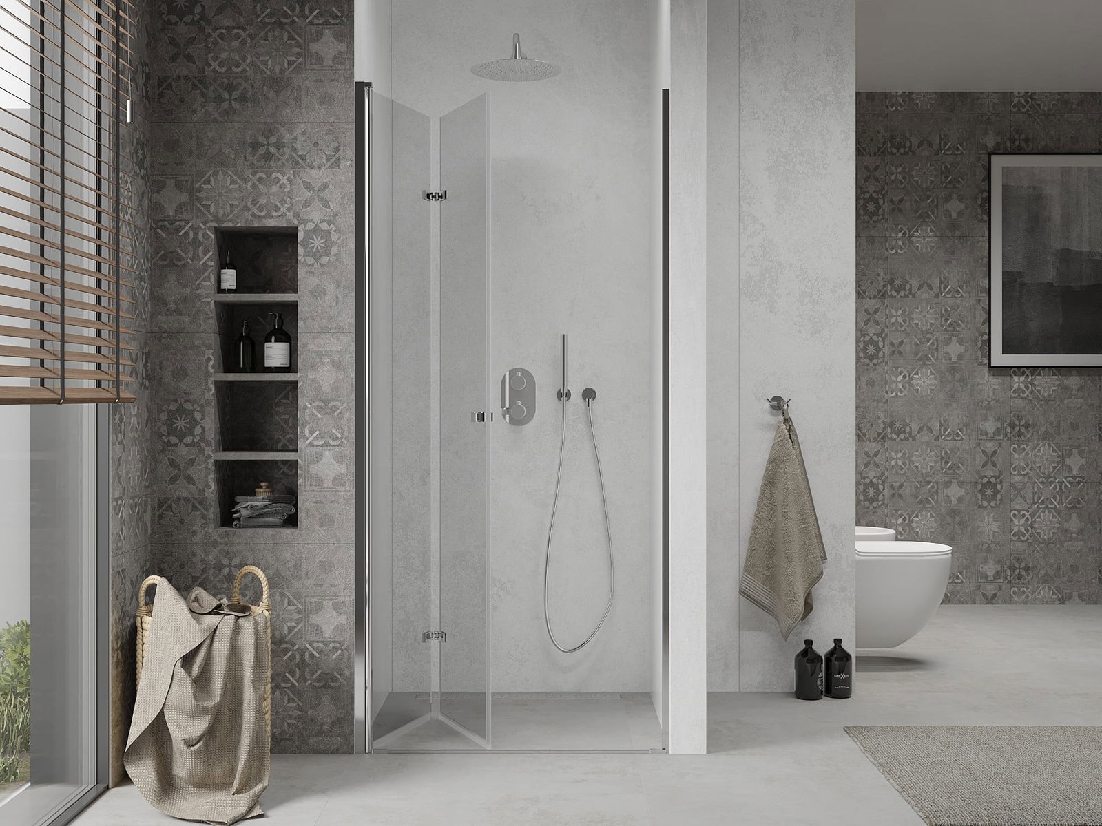 A pega prática e confortável foi feita de metal durável e resistente. A forma moderna combinada com o acabamento ajustado à cor dos perfis confere a todo o conjunto uma aparência moderna e estilosa, realçando a estética de qualquer casa de banho.