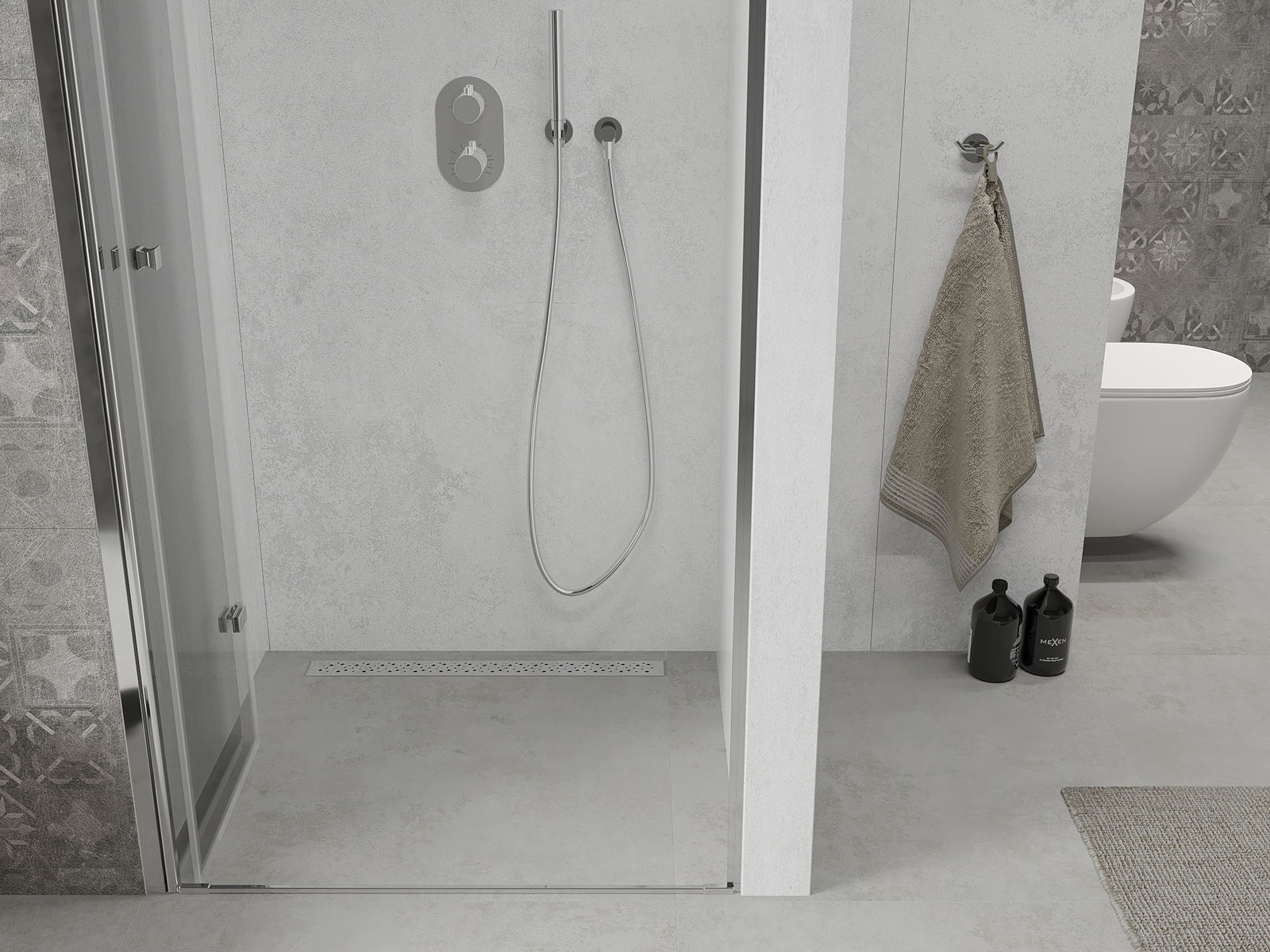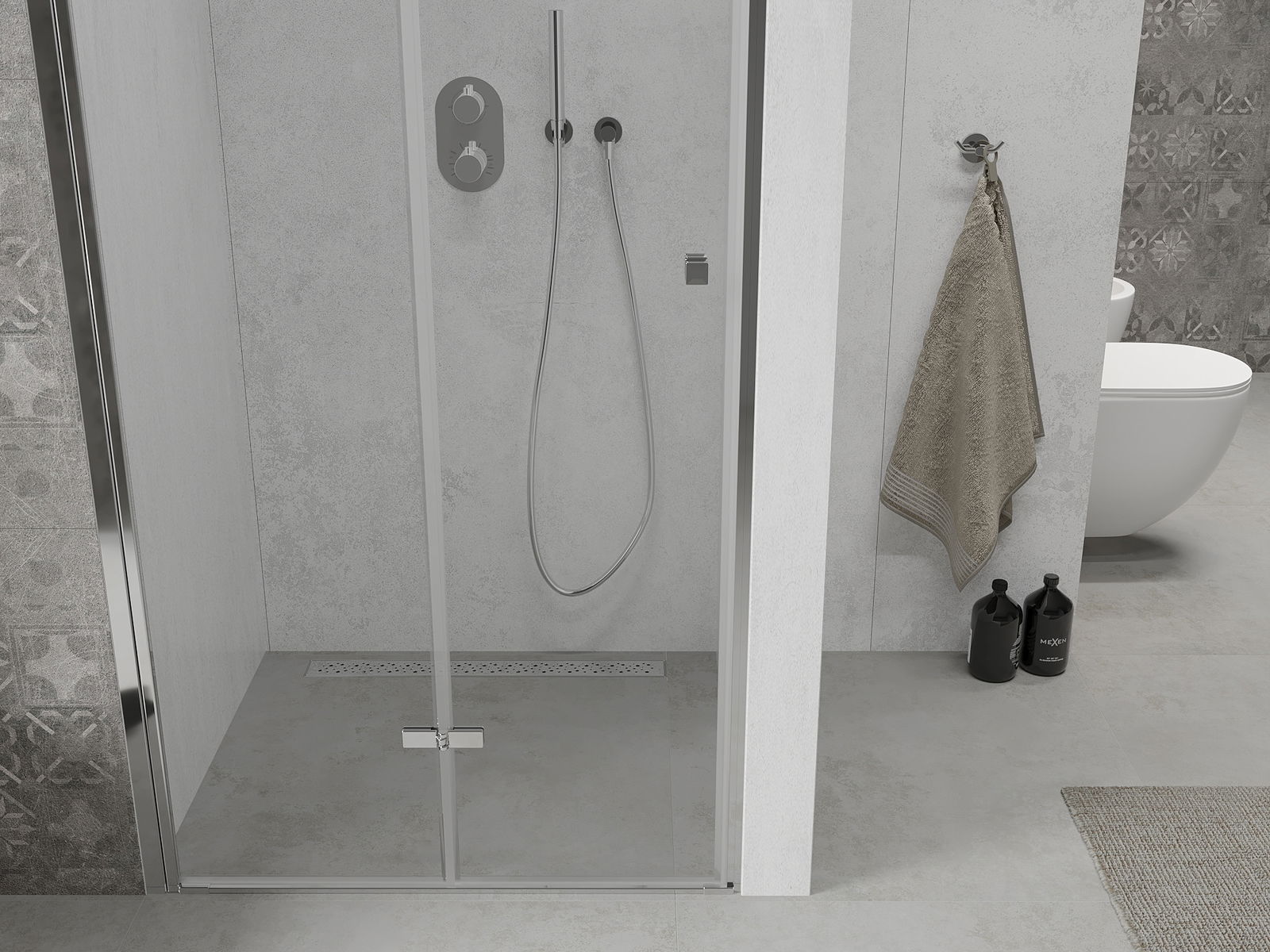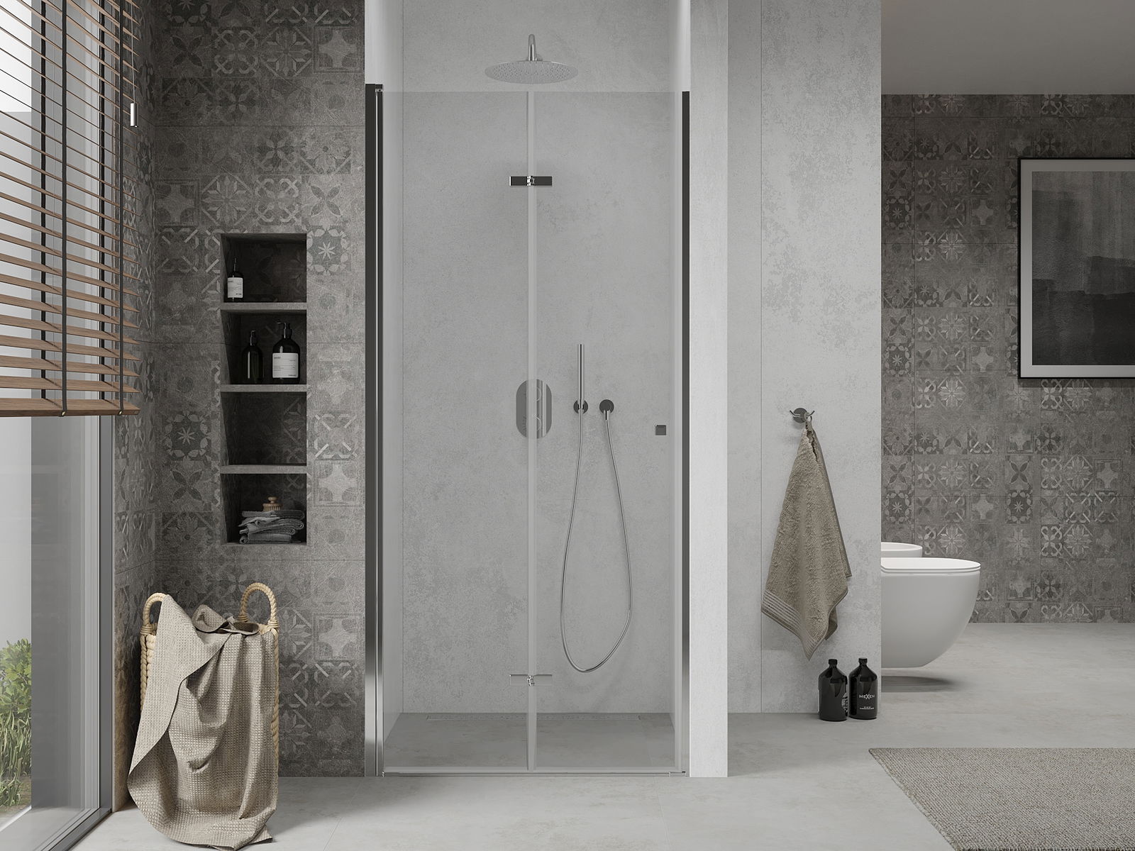 A pega prática e confortável foi feita de metal durável e resistente. A forma moderna combinada com o acabamento ajustado à cor dos perfis confere a todo o conjunto uma aparência moderna e estilosa, realçando a estética de qualquer casa de banho.