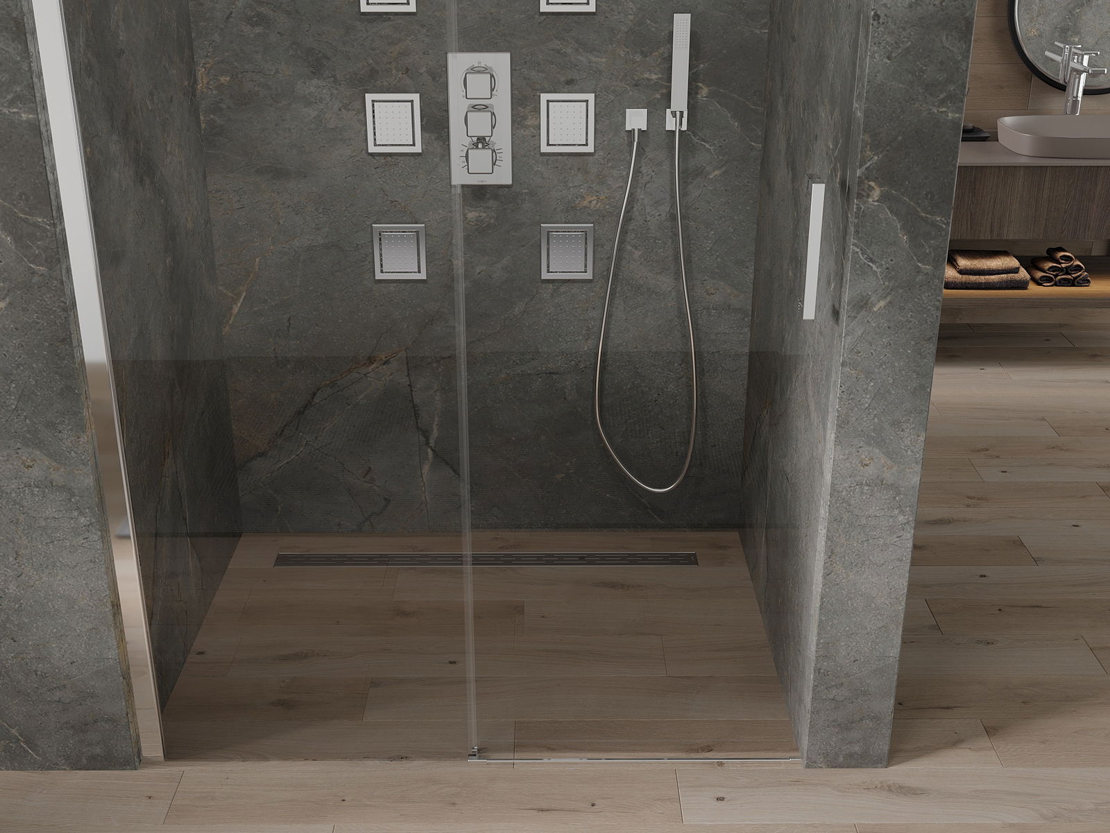 As portas de correr movem-se em guias especiais e não requerem espaço adicional para serem abertas, por isso são ideais para casas de banho menores. Graças aos rolos duplos com corpo de metal, o seu movimento é suave.