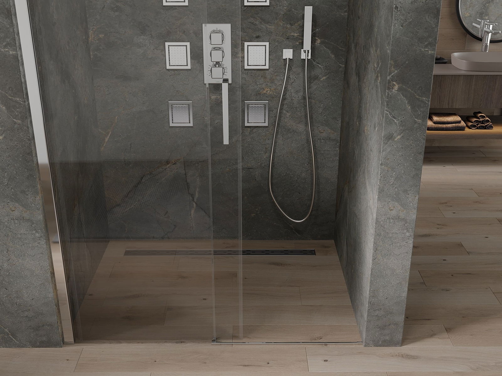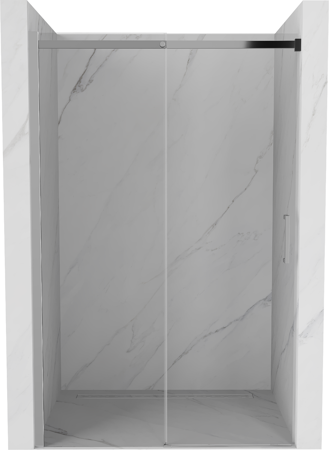 As portas de correr movem-se em guias especiais e não requerem espaço adicional para serem abertas, por isso são ideais para casas de banho menores. Graças aos rolos duplos com corpo de metal, o seu movimento é suave.