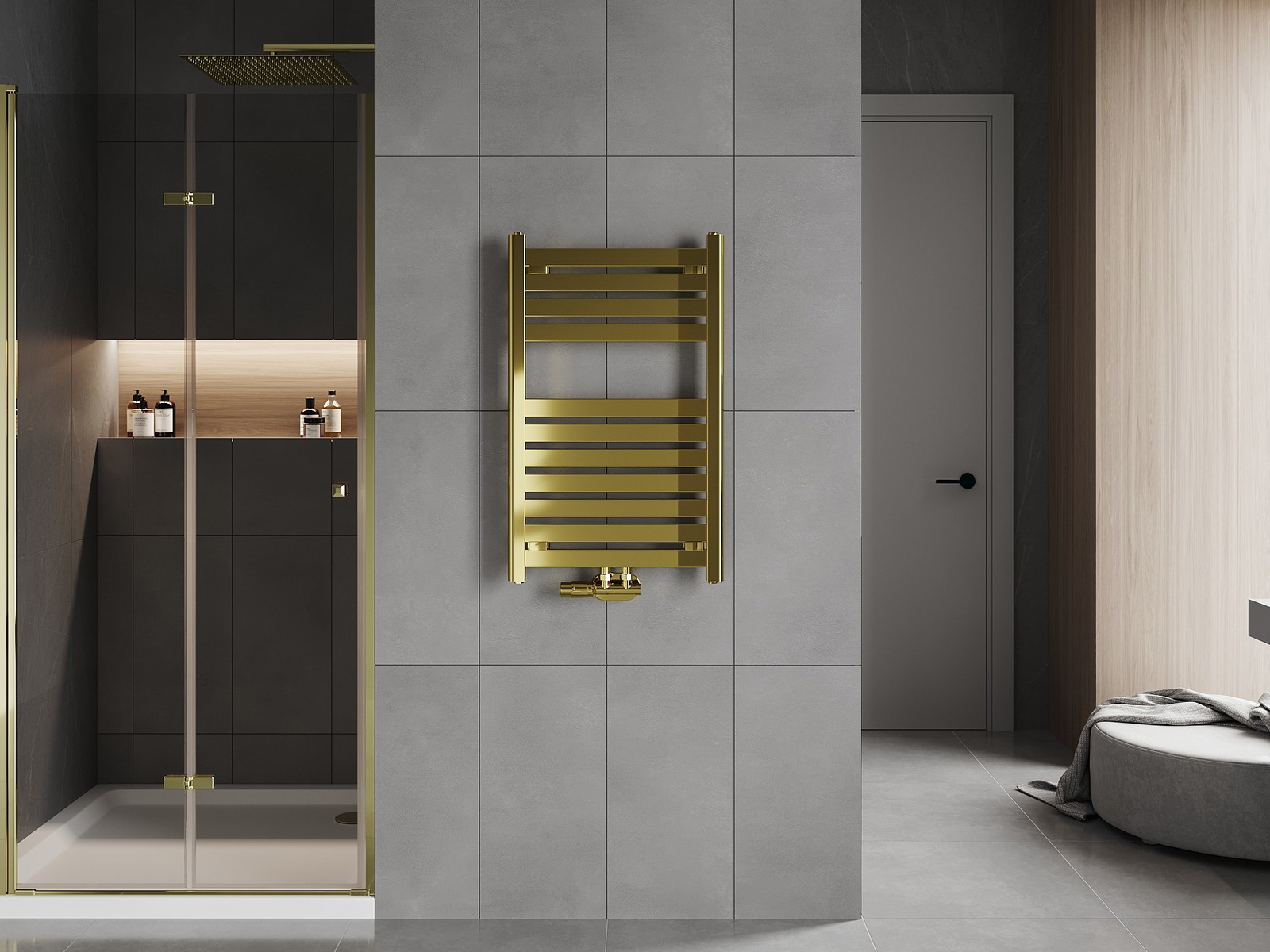 Mexen Uran é um elegante radiador de casa de banho com dimensões de 800 x 500 mm e potência de 287 W, que combina perfeitamente função e elegância. Feito de aço, revestido com uma camada de pintura dourada resistente à corrosão, garante durabilidade e resistência. O design compacto e a possibilidade de diversas ligações (inferior ou central) fazem com que se ajuste a qualquer casa de banho. A temperatura máxima de operação até 95°C e pressão de trabalho de 0,4 MPa atestam a alta qualidade. O conjunto inclui todos os acessórios de montagem necessários.