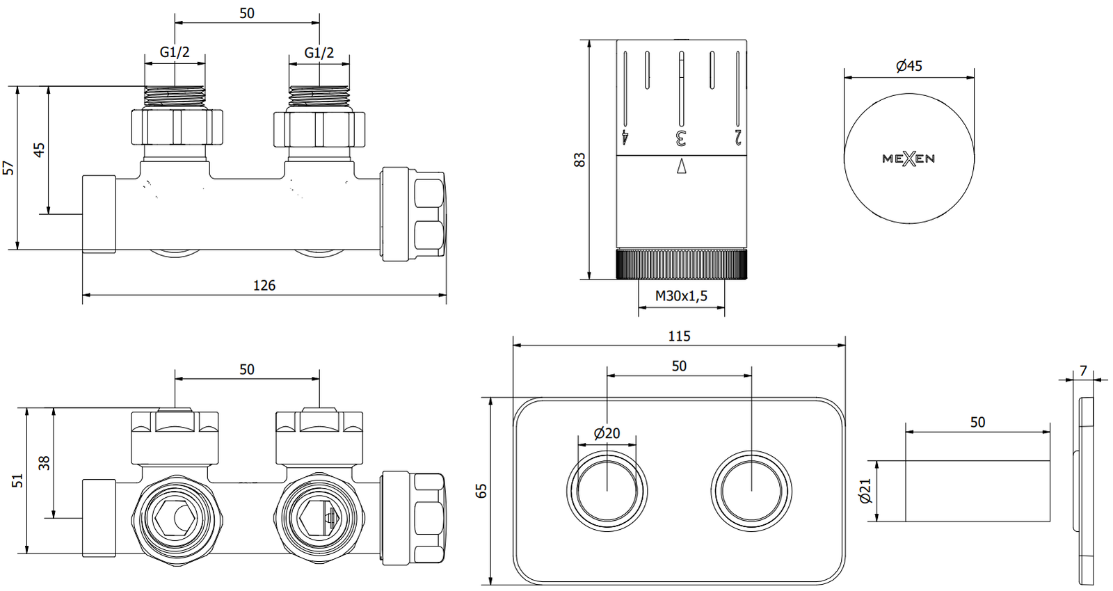 Espaçamento dos furos para conexões de radiador: 50 mm