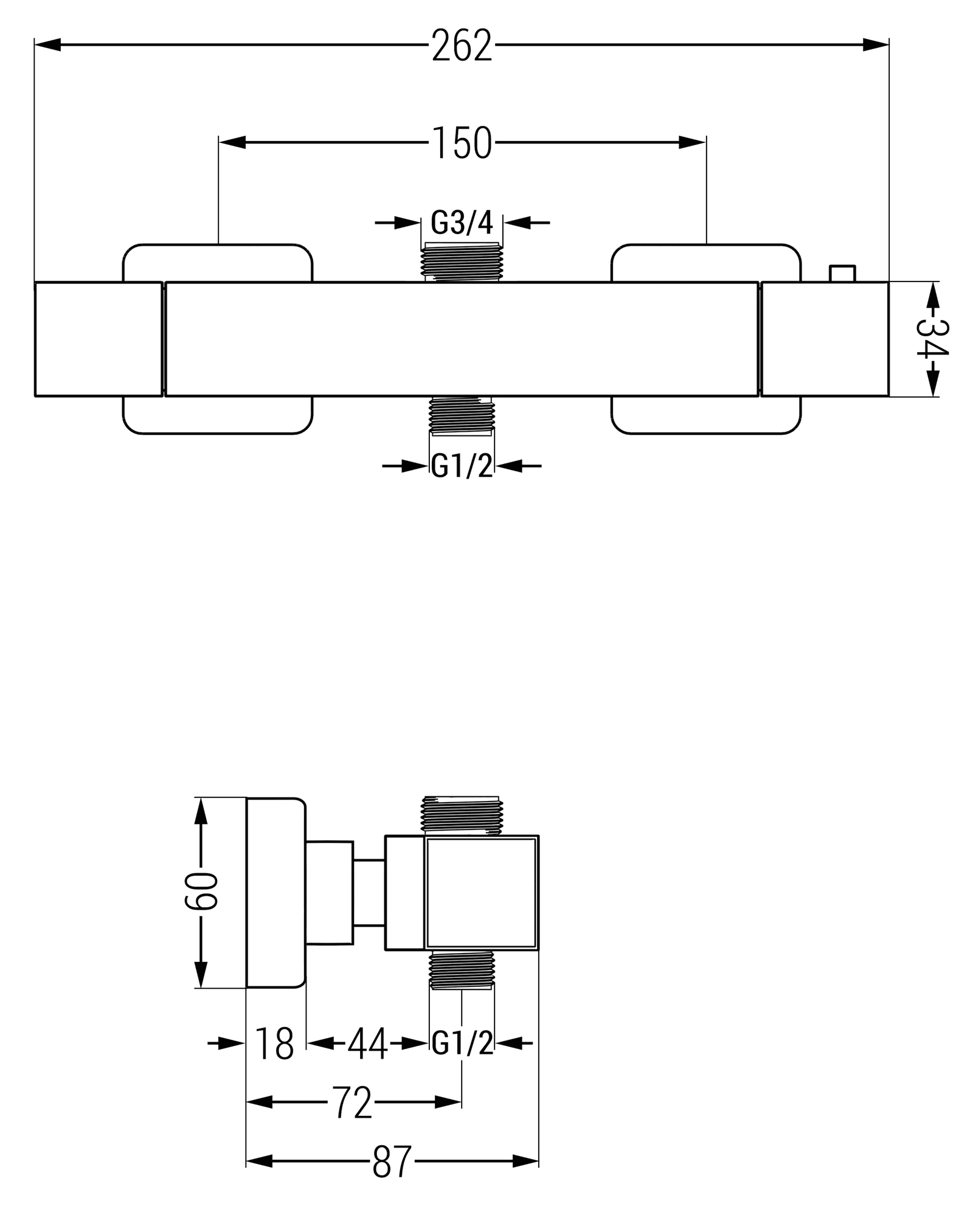 Ligação do chuveiro: G 3/4" (superior) e G 1/2" (inferior)