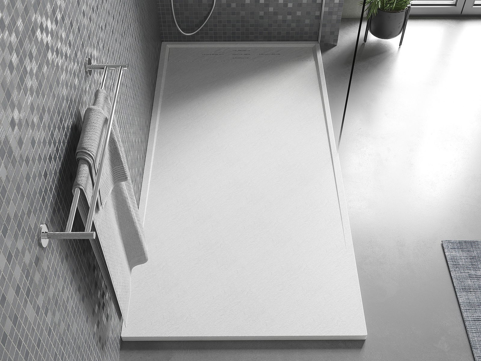 A superfície do tabuleiro do chuveiro assemelha-se a uma pedra na sua estrutura. Constitui uma combinação excecional de aparência natural com um design de interiores moderno. Adiciona caráter, realça a estética e a elegância da decoração da casa de banho e encanta com a sua forma.