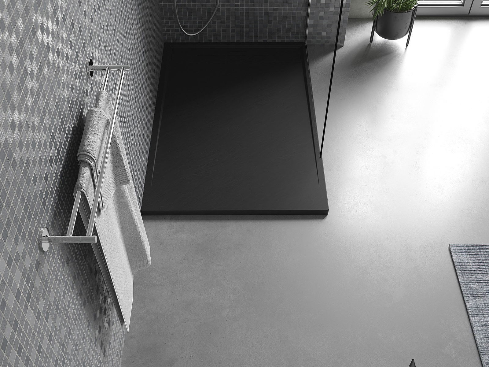 A superfície do tabuleiro do chuveiro assemelha-se a uma pedra na sua estrutura. Constitui uma combinação excecional de aparência natural com um design de interiores moderno. Adiciona caráter, realça a estética e a elegância da decoração da casa de banho e encanta com a sua forma.