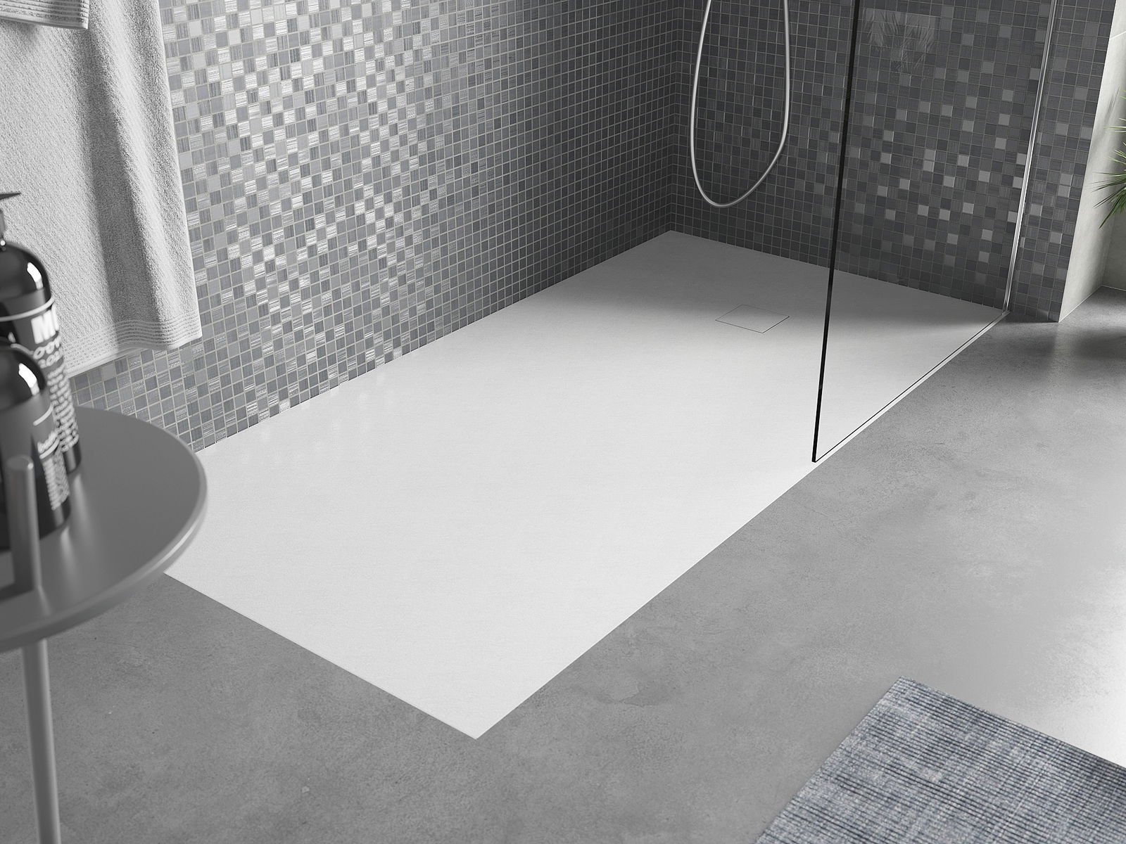 A superfície do tabuleiro do chuveiro assemelha-se a uma pedra na sua estrutura. Constitui uma combinação excecional de aparência natural com um design de interiores moderno. Adiciona caráter, realça a estética e a elegância da decoração da casa de banho e encanta com a sua forma.