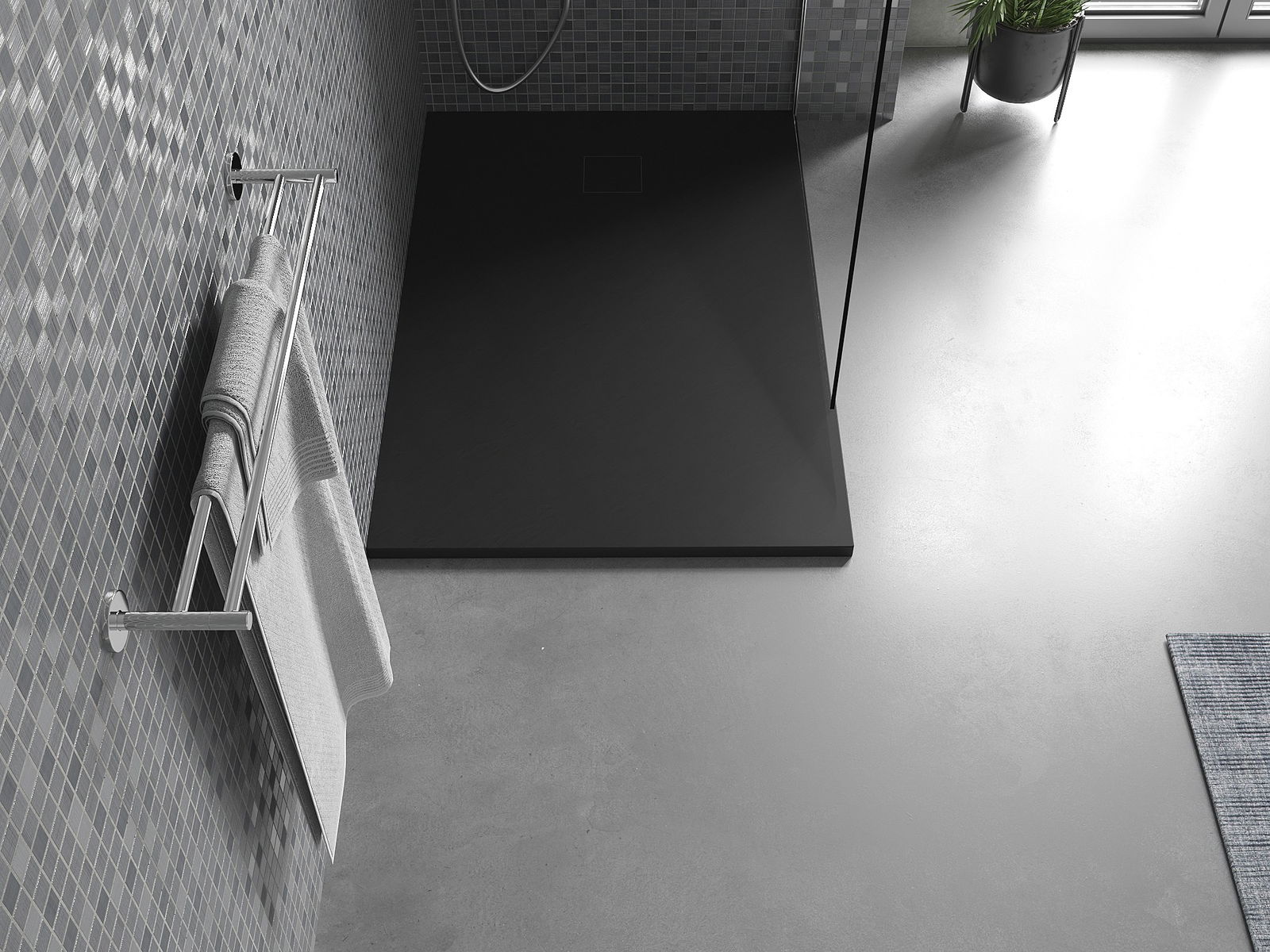 A superfície do tabuleiro do chuveiro assemelha-se a uma pedra na sua estrutura. Constitui uma combinação excecional de aparência natural com um design de interiores moderno. Adiciona caráter, realça a estética e a elegância da decoração da casa de banho e encanta com a sua forma.