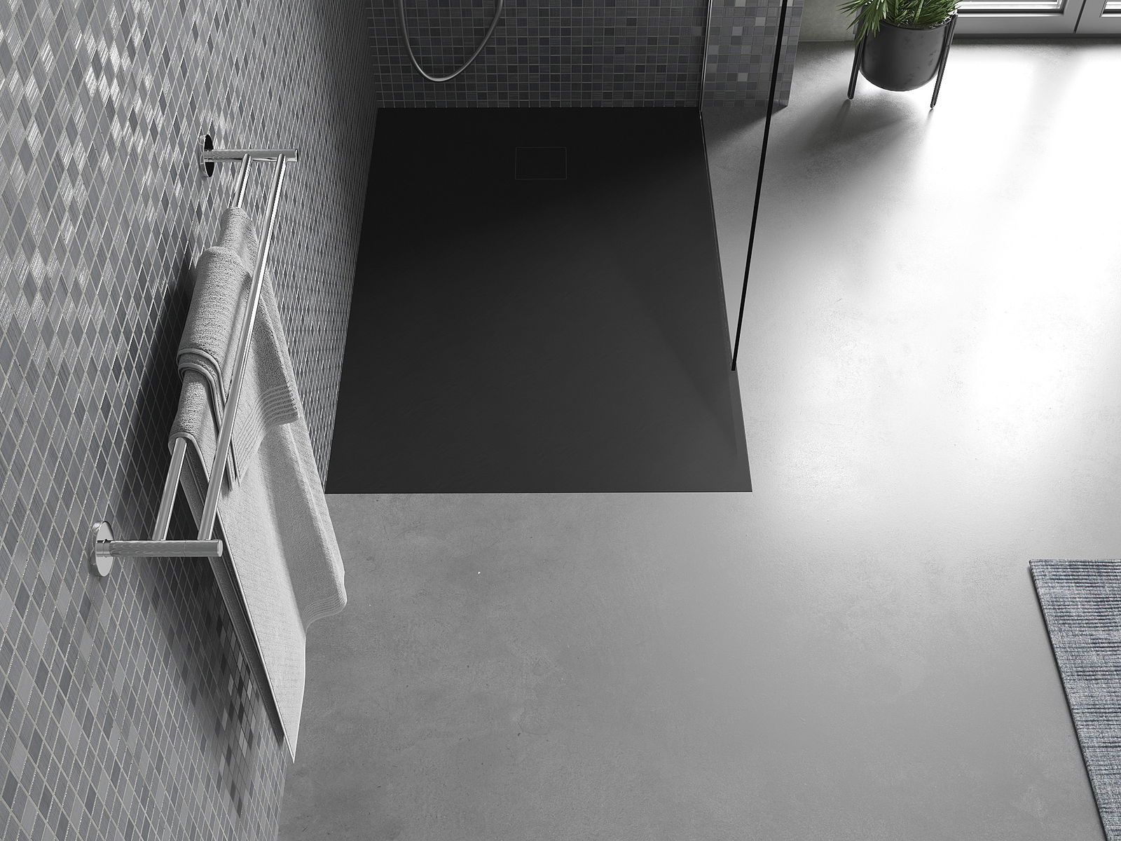 A superfície do tabuleiro do chuveiro assemelha-se a uma pedra na sua estrutura. Constitui uma combinação excecional de aparência natural com um design de interiores moderno. Adiciona caráter, realça a estética e a elegância da decoração da casa de banho e encanta com a sua forma.