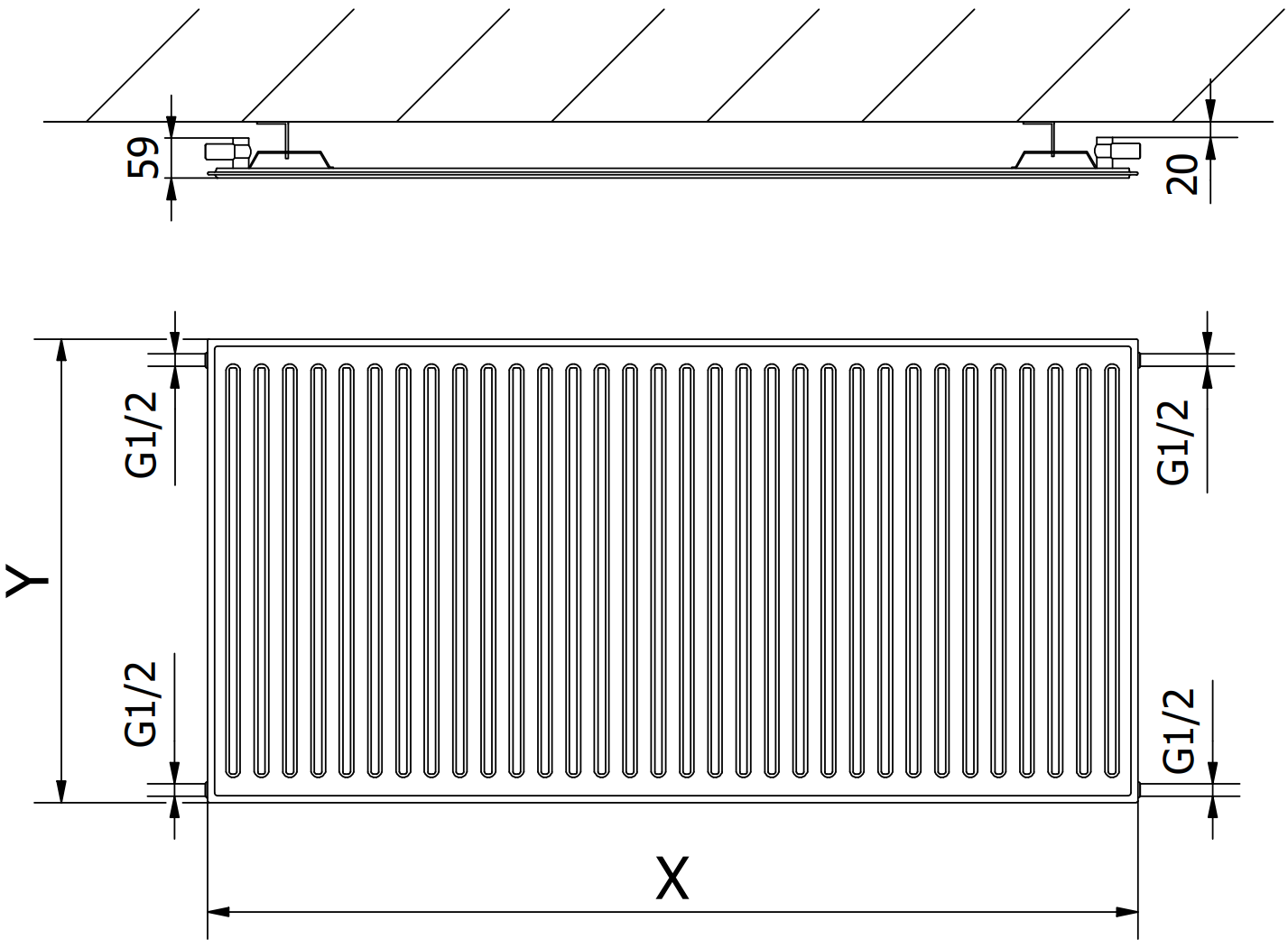As imagens mostram o radiador no tamanho 600 x 1200 mm.