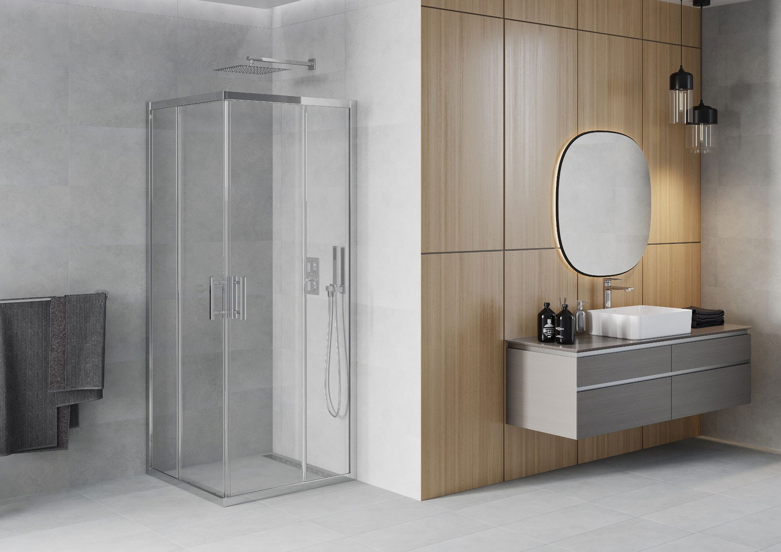 As portas de correr movem-se em calhas especiais e não requerem espaço adicional para serem abertas, por isso são ideais para casas de banho mais pequenas. Graças aos rolos duplos de plástico durável, o seu movimento é suave.
