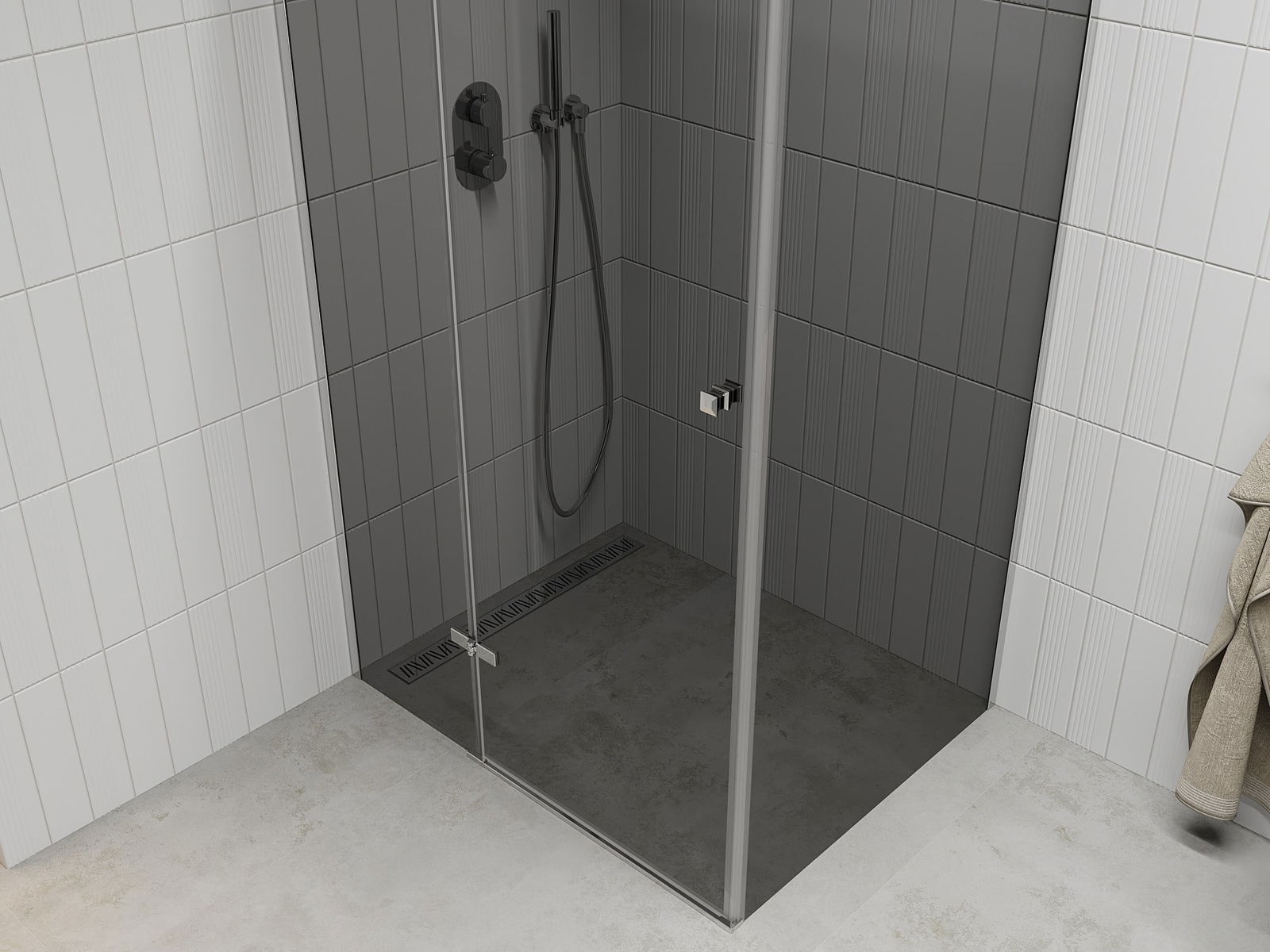 A pega prática e confortável foi feita de metal durável e resistente. A forma moderna combinada com o acabamento ajustado à cor dos perfis confere a todo o conjunto uma aparência moderna e estilosa, realçando a estética de qualquer casa de banho.