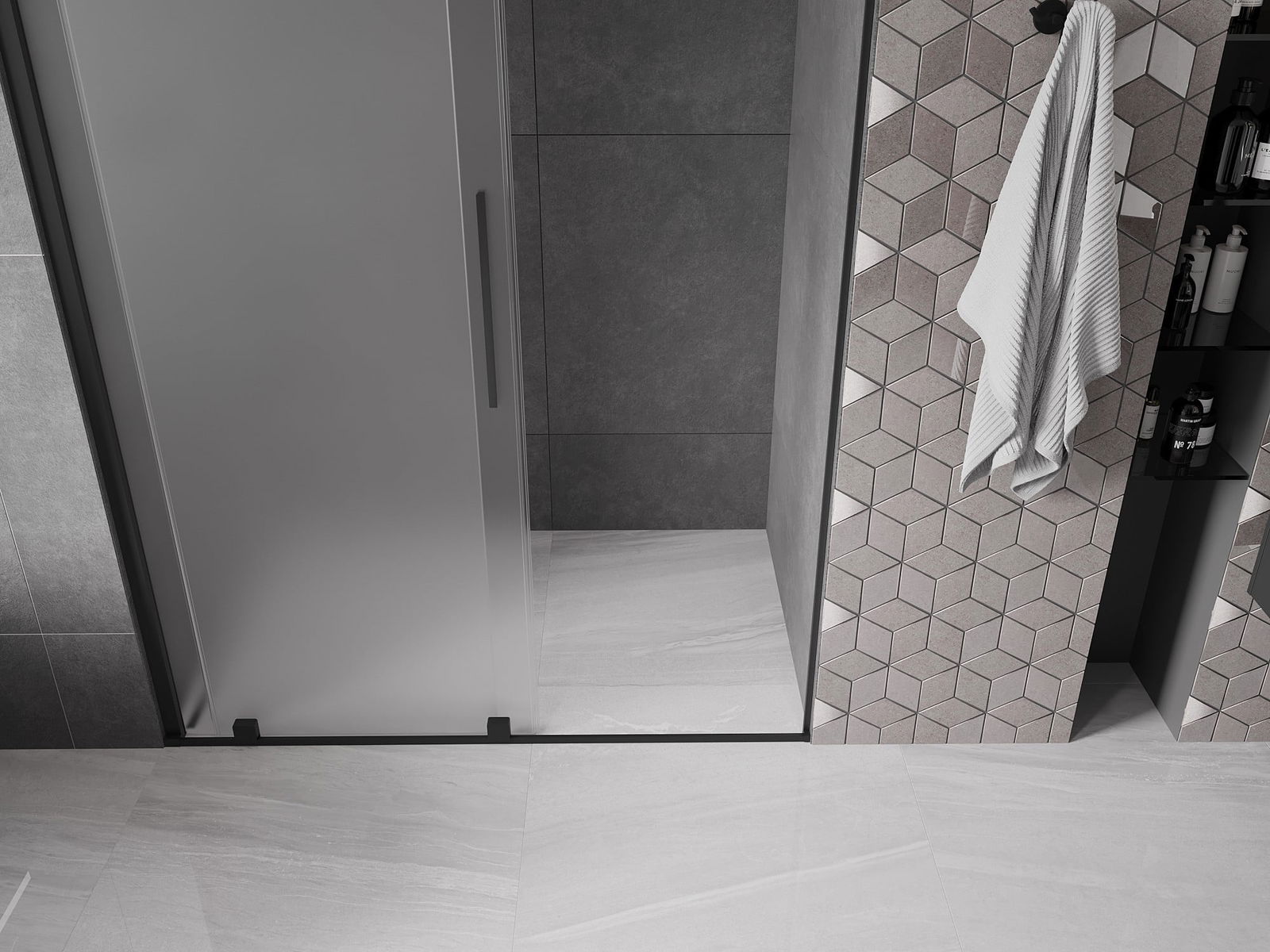 Pega prática e confortável feita de aço inoxidável. A forma moderna, combinada com o acabamento adaptado à cor dos perfis, dá ao conjunto uma aparência moderna e estilosa, realçando a estética de qualquer casa de banho.