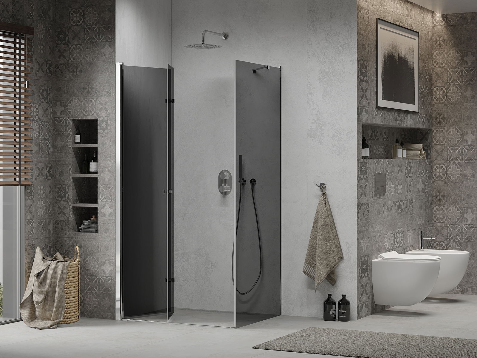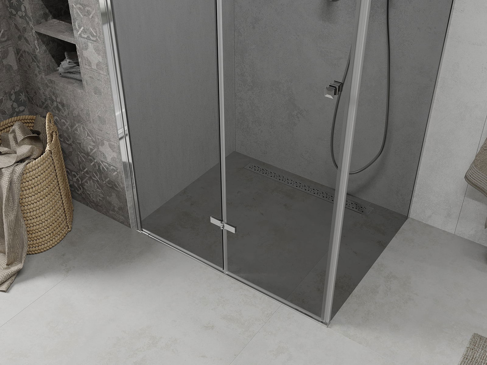 A pega prática e confortável foi feita de metal durável e resistente. A forma moderna combinada com o acabamento ajustado à cor dos perfis confere a todo o conjunto uma aparência moderna e estilosa, realçando a estética de qualquer casa de banho.