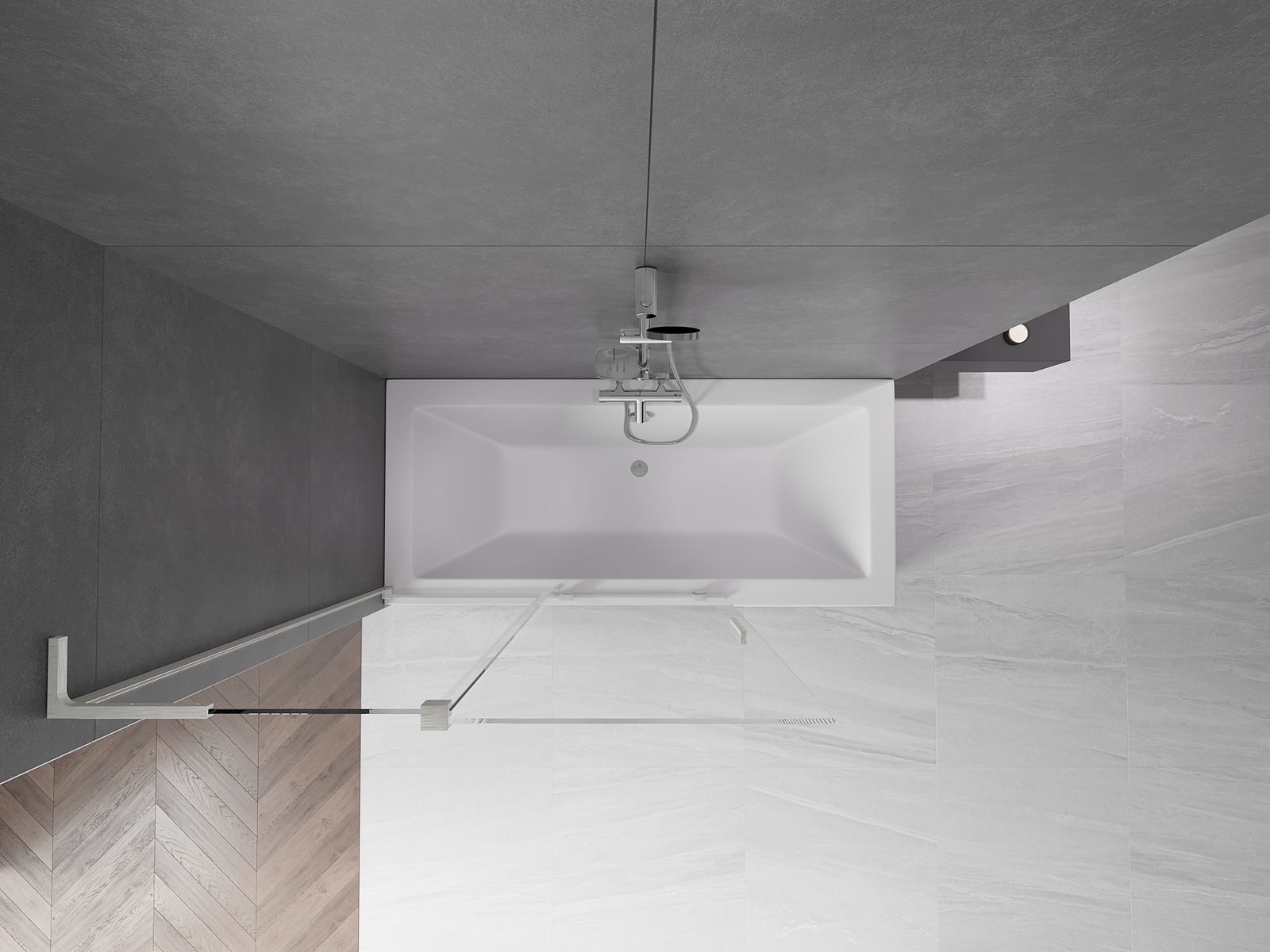 Proteção eficaz contra o derramamento de água durante o banho. O parapeito possui vedações que se ajustam perfeitamente à superfície do vidro e à borda da banheira. Solução funcional que garante segurança e fácil manutenção da limpeza.