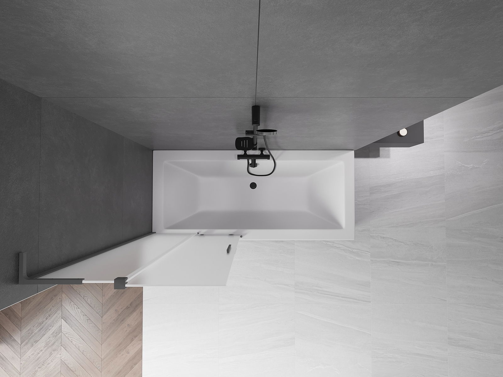 Proteção eficaz contra o derramamento de água durante o banho. O parapeito possui vedações que se ajustam perfeitamente à superfície do vidro e à borda da banheira. Solução funcional que garante segurança e fácil manutenção da limpeza.