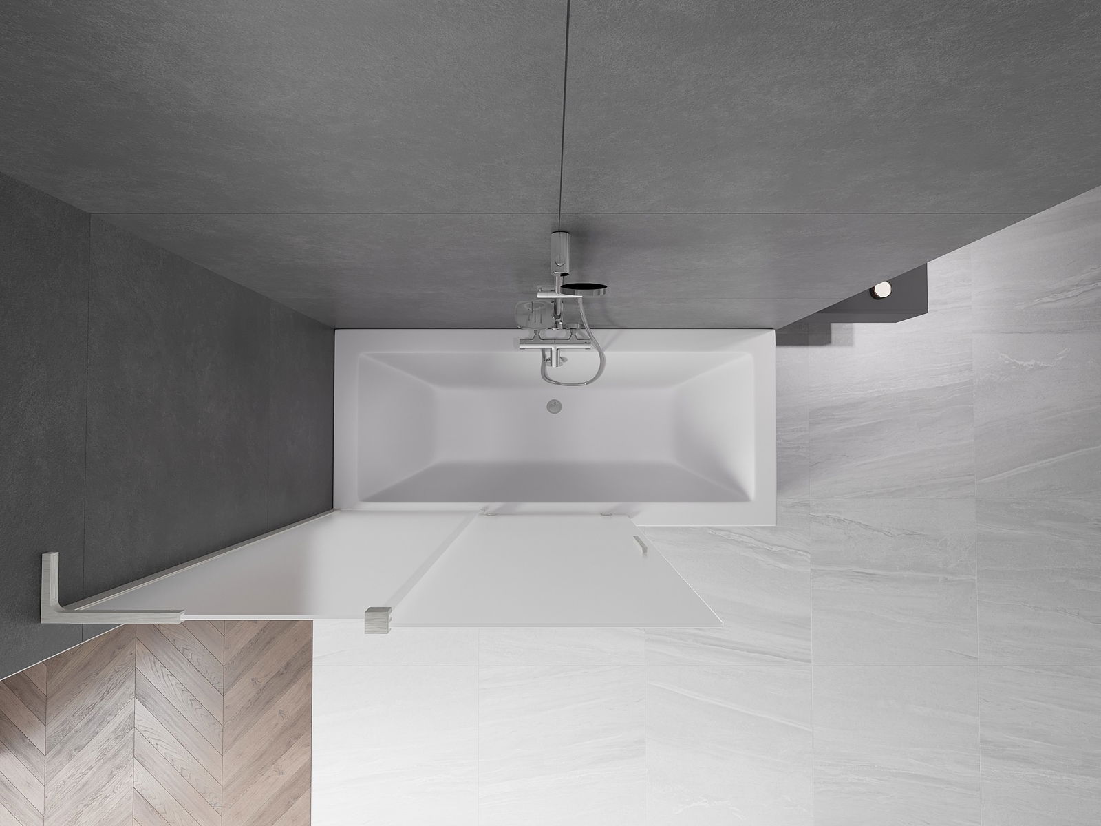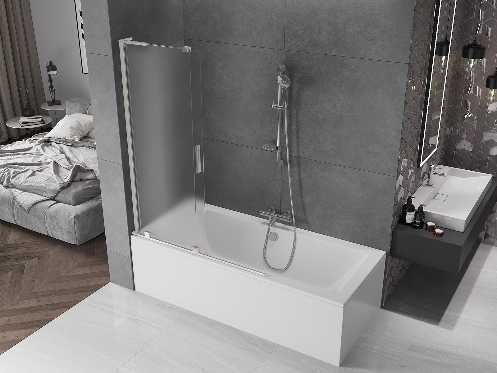 Proteção eficaz contra o derramamento de água durante o banho. O parapeito possui vedações que se ajustam perfeitamente à superfície do vidro e à borda da banheira. Solução funcional que garante segurança e fácil manutenção da limpeza.