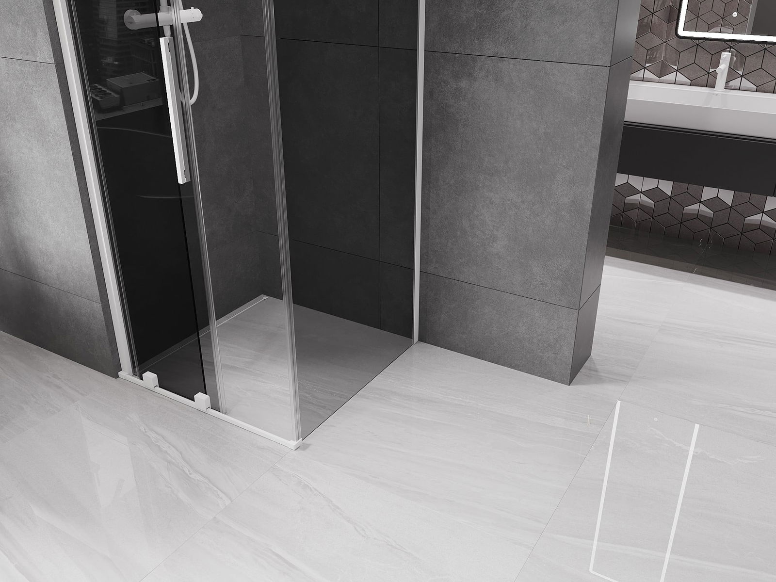 Pega prática e confortável feita de aço inoxidável. A forma moderna, combinada com o acabamento adaptado à cor dos perfis, dá ao conjunto uma aparência moderna e estilosa, realçando a estética de qualquer casa de banho.