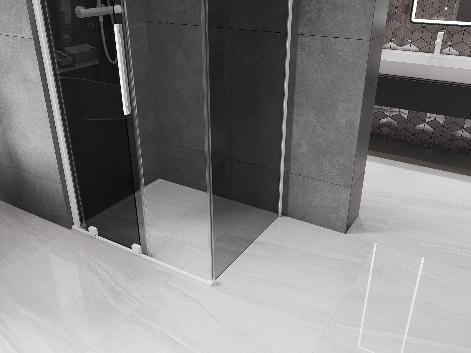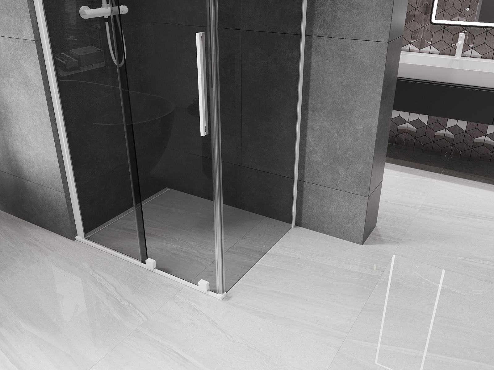 Pega prática e confortável feita de aço inoxidável. A forma moderna, combinada com o acabamento adaptado à cor dos perfis, dá ao conjunto uma aparência moderna e estilosa, realçando a estética de qualquer casa de banho.