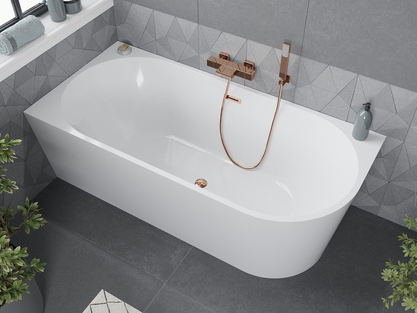 A banheira independente de canto Mexen Mia é a solução ideal para a sua casa de banho. As dimensões de 160 x 75 cm e a profundidade de 45 cm garantem conforto de utilização. Fabricada em acrílico sanitário, na cor branca, com um elegante acabamento em ouro rosa, adapta-se a interiores modernos. A abertura de transbordo e o sifão incluído aumentam a funcionalidade. A resistência ao embaciamento e à radiação UV garante um brilho duradouro. A montagem de canto e o design retangular adicionam estilo a qualquer casa de banho.
