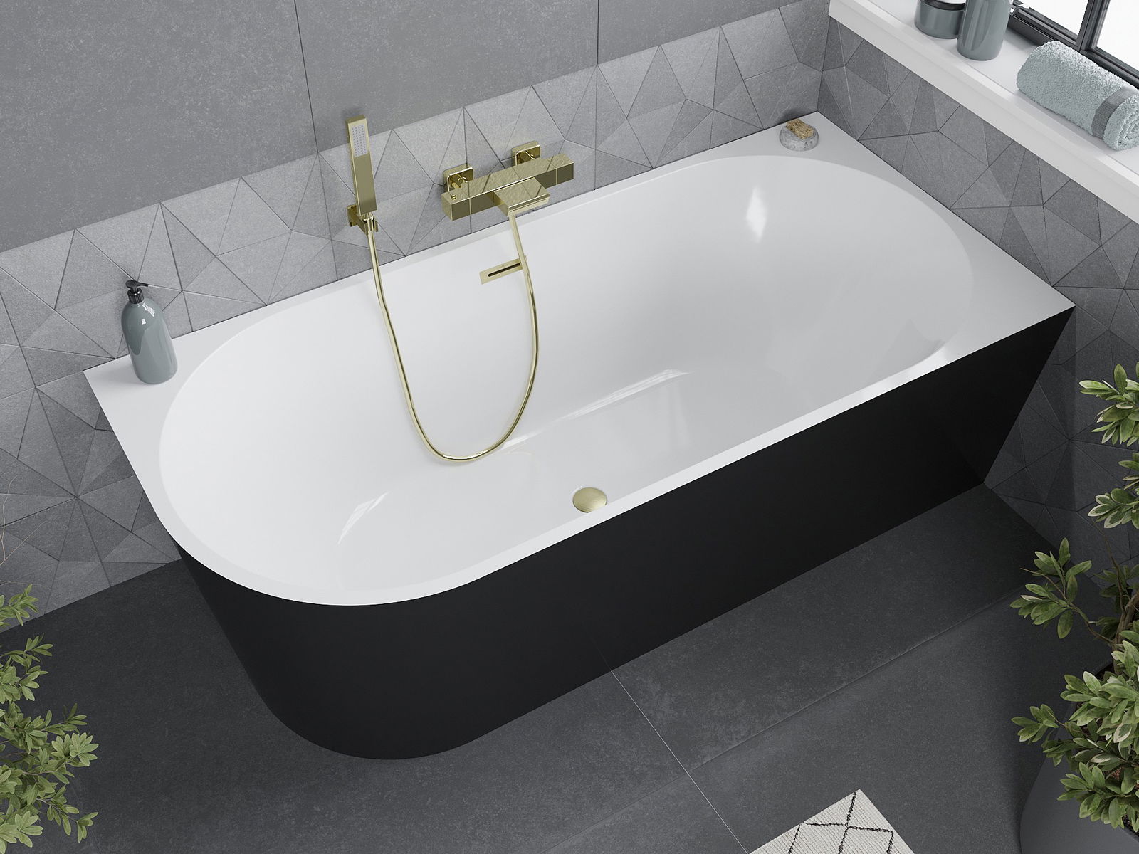 Mexen Mia banheira autoportante de canto direito 180 x 80 cm, branco/preto, transbordo dourado escovado - 52691808075P-55
