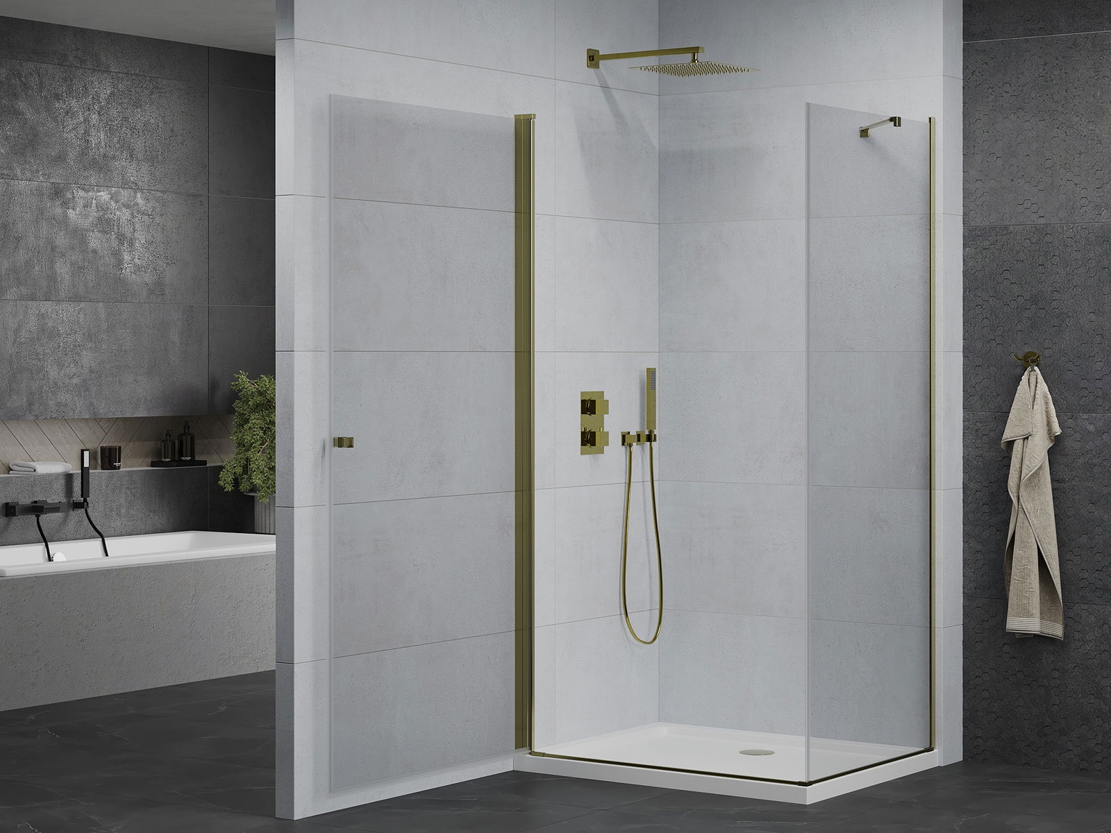 Mexen Pretoria cabine de duche com porta oscilante 70 x 90 cm, transparente, dourada + base de duche Flat