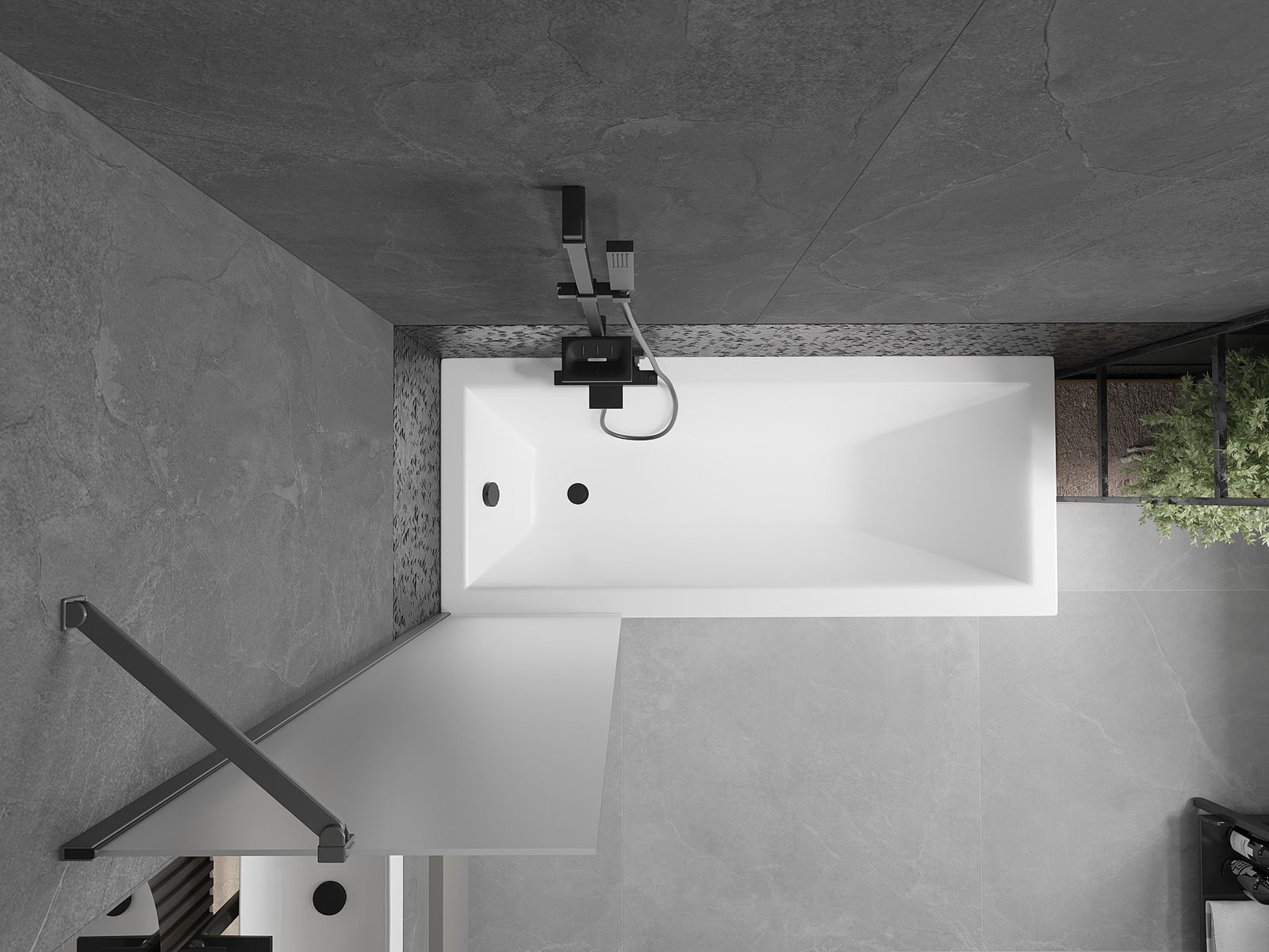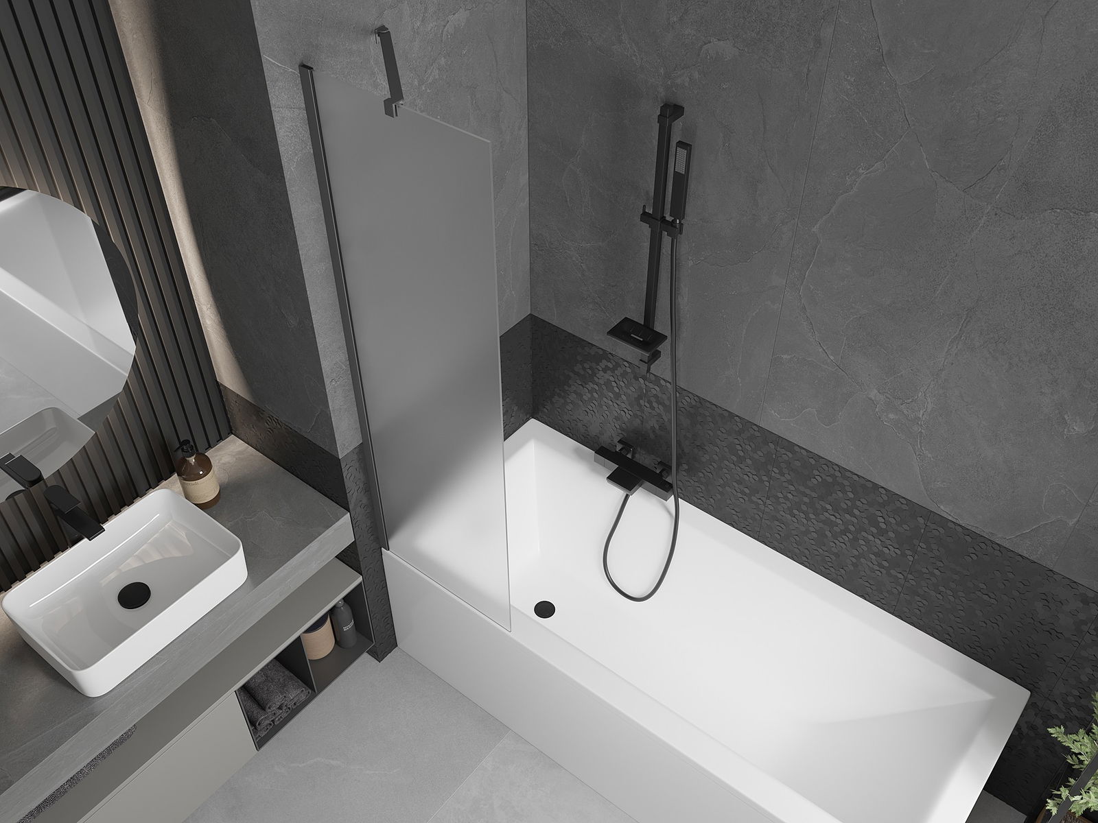 Proteção eficaz contra o derramamento de água durante o banho. O parapeito possui vedações que se ajustam perfeitamente à superfície do vidro e à borda da banheira. Solução funcional que garante segurança e fácil manutenção da limpeza.