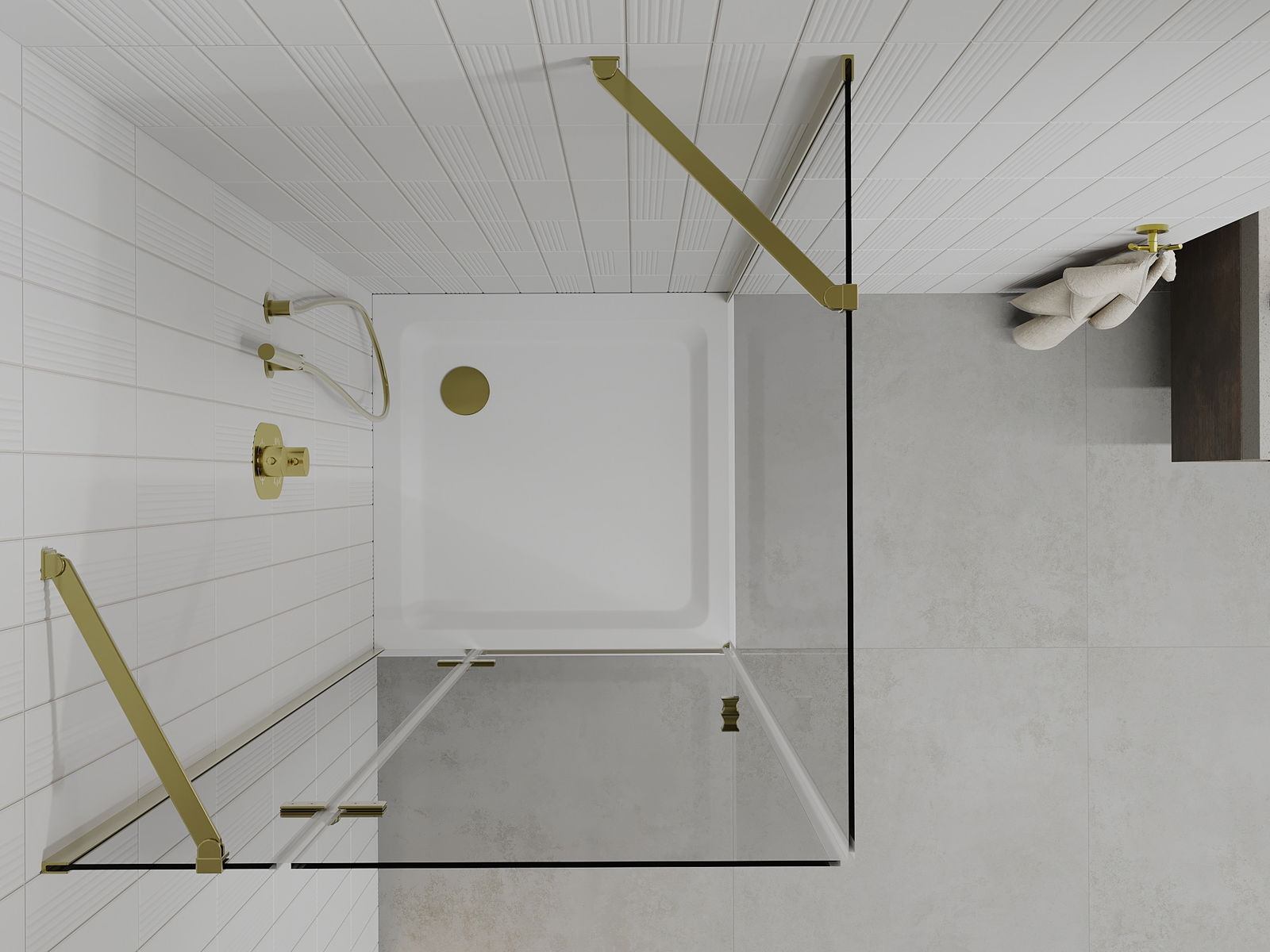 Mexen Roma cabine de duche com porta de abrir 90 x 90 cm, transparente, dourada + base de duche Flat - 854-090-090-50-00-4010