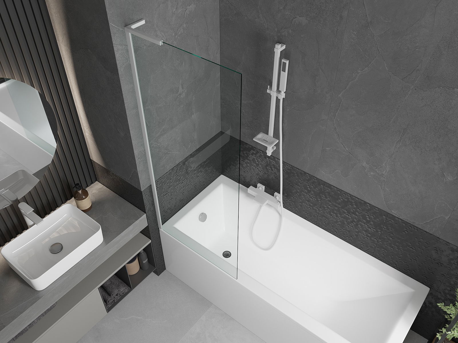 Proteção eficaz contra o derramamento de água durante o banho. O parapeito possui vedações que se ajustam perfeitamente à superfície do vidro e à borda da banheira. Solução funcional que garante segurança e fácil manutenção da limpeza.