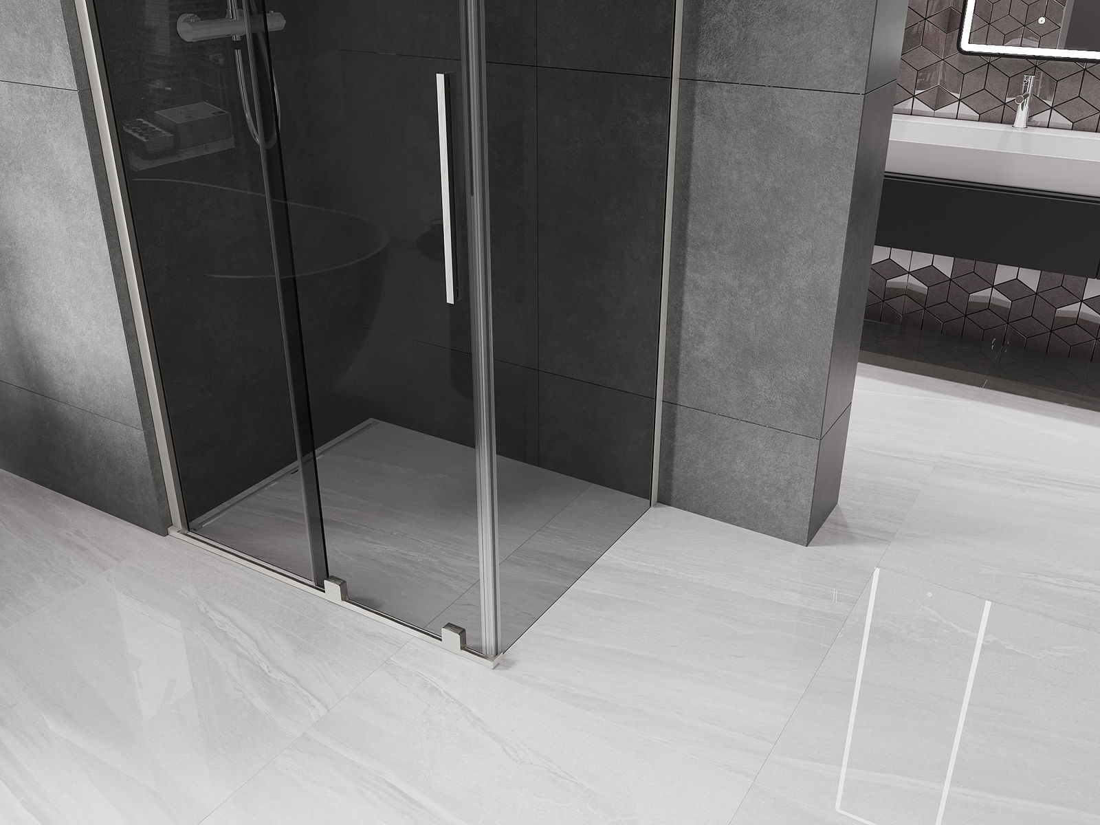 Pega prática e confortável feita de aço inoxidável. A forma moderna, combinada com o acabamento adaptado à cor dos perfis, dá ao conjunto uma aparência moderna e estilosa, realçando a estética de qualquer casa de banho.