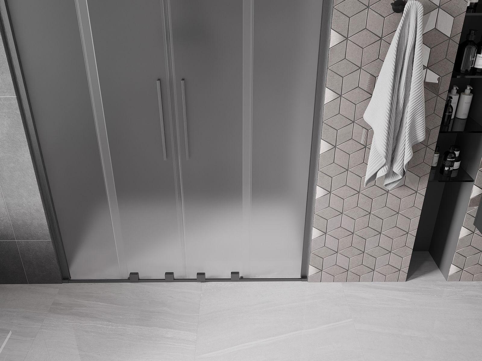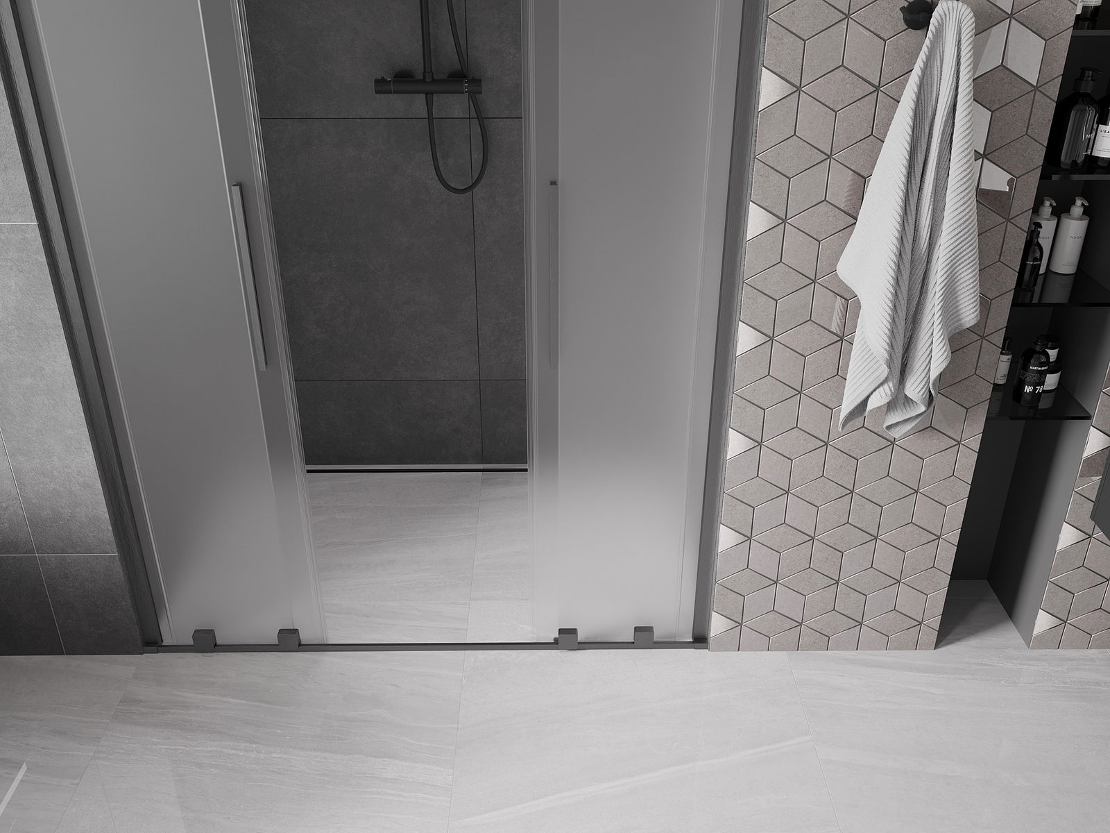 Pega prática e confortável feita de aço inoxidável. A forma moderna, combinada com o acabamento adaptado à cor dos perfis, dá ao conjunto uma aparência moderna e estilosa, realçando a estética de qualquer casa de banho.