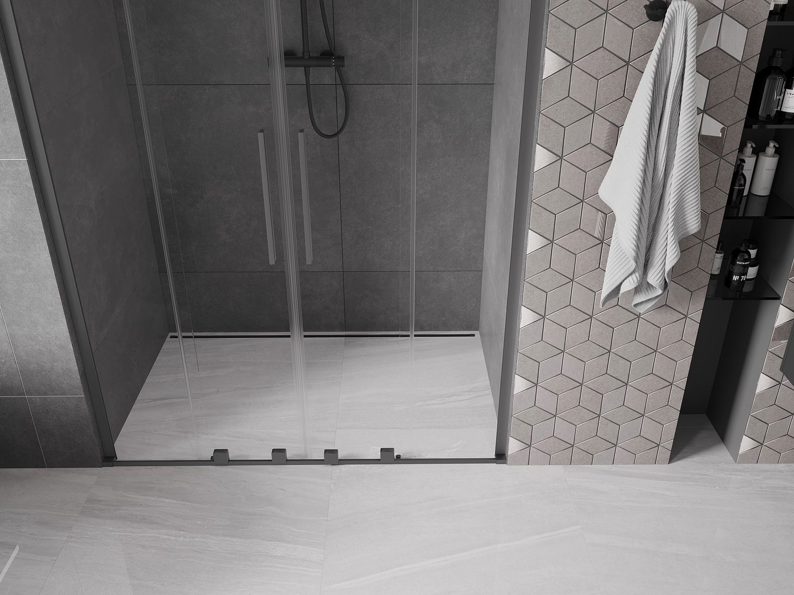 Pega prática e confortável feita de aço inoxidável. A forma moderna, combinada com o acabamento adaptado à cor dos perfis, dá ao conjunto uma aparência moderna e estilosa, realçando a estética de qualquer casa de banho.